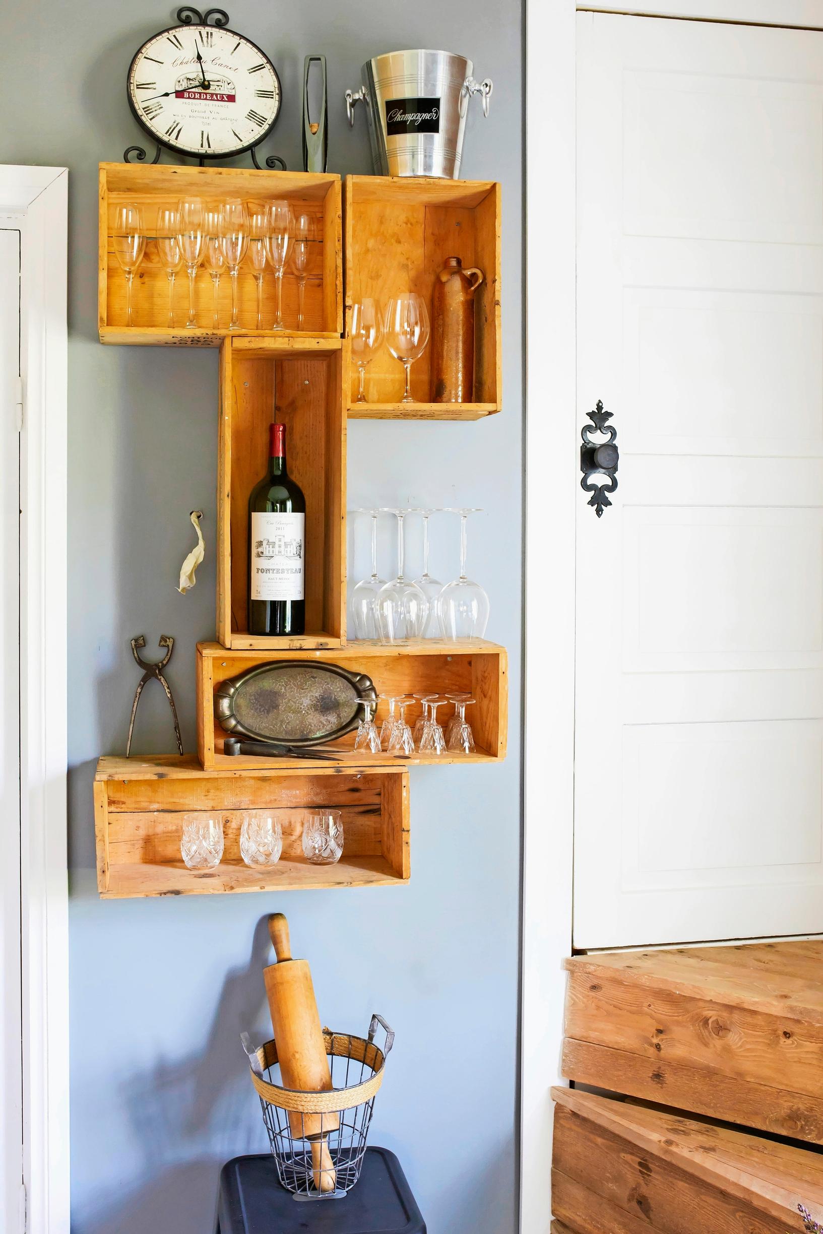 A playful open shelving display made from old wine crates is arranged on the kitchen wall.