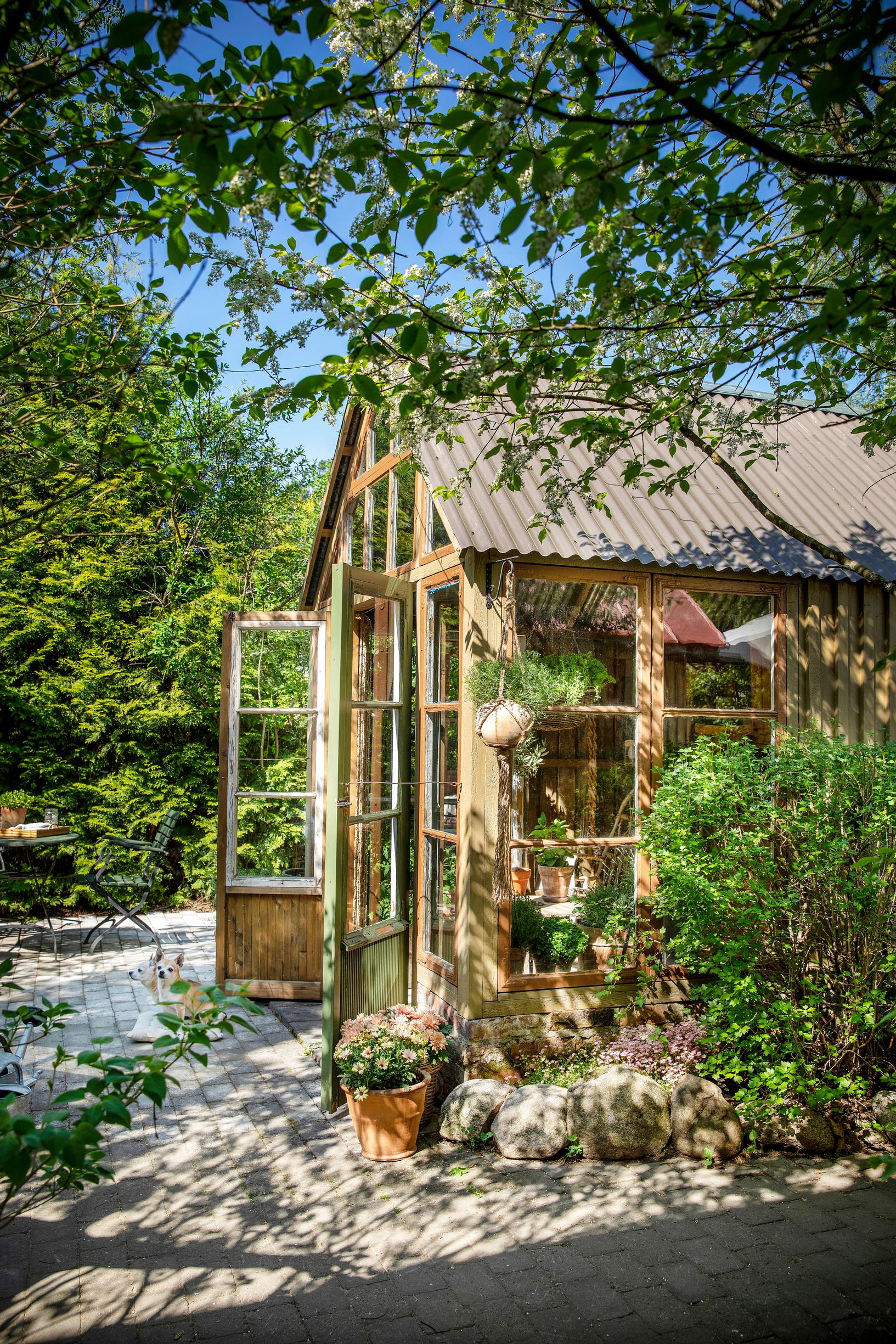 Maria Meder’s greenhouse was built from old windows and reclaimed roof panels. The foundation is made of old bricks. Only the clear roof panels, frame, and wall boards are new. Despite its small size, the greenhouse has even hosted parties.