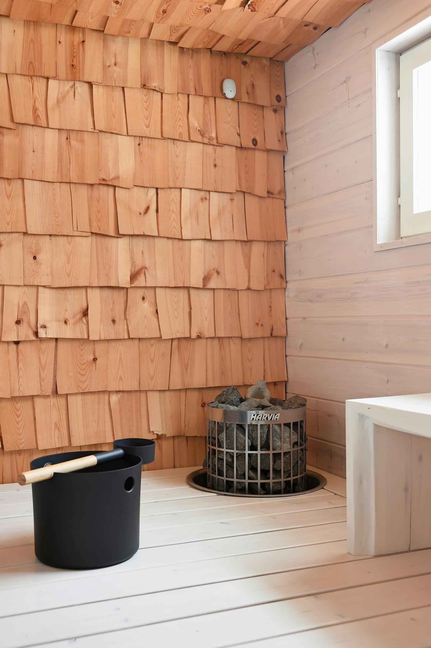 A modern sauna gets added warmth and character from shingle cladding. The shingle-clad wall continues across the ceiling through the entire shower area. The shingles were left over after a relative’s roof renovation. The shingle surfaces are treated with a clear sauna finish, and the spruce benches with white sauna wax.