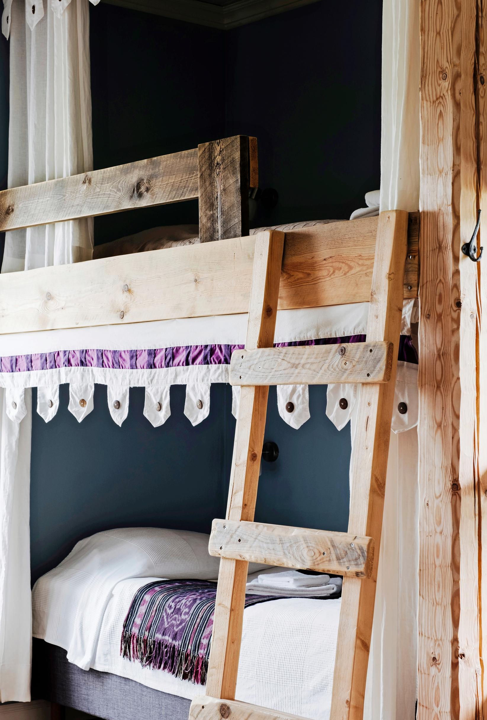 These beds were built from wood from the local forest, and they reuse timbers left over from the scaffolding in their own renovation. At Villa Mandala [in Finnish] there are even more reuse projects: the long dining table was made from old boards from the barn loft.
