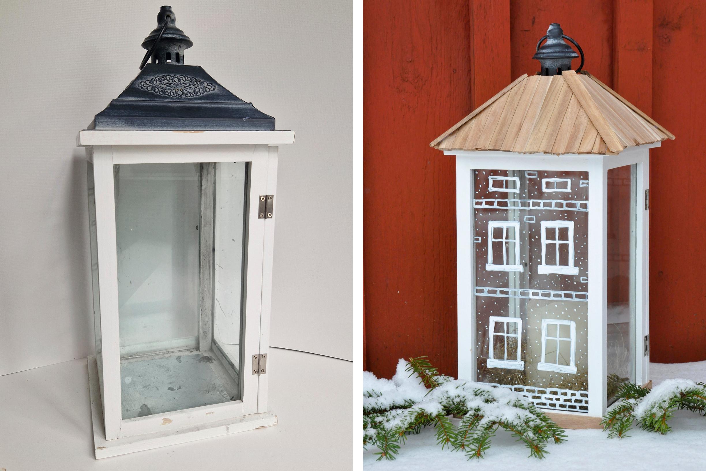 An old glass-sided lantern transforms into a cozy light up house with a paint marker. When the LED candle lights up, the lantern house gets truly cozy.
