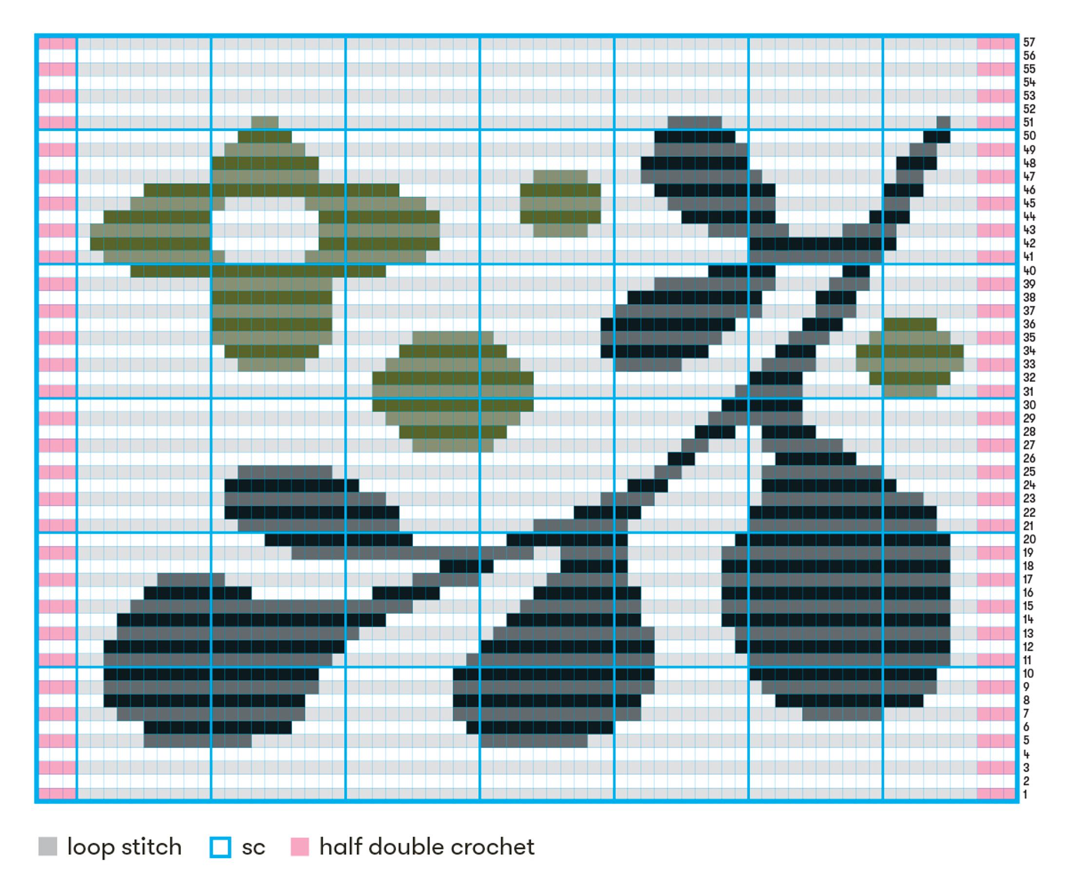 *Row 1: work sc; change colors as indicated on the chart. Row 2: work loop stitches; change colors as indicated on the chart. To start and end each loop-stitch row, work 3 hdc.* Repeat from * to * until you have completed all the rows on the chart. Work 2 more rows of sc.