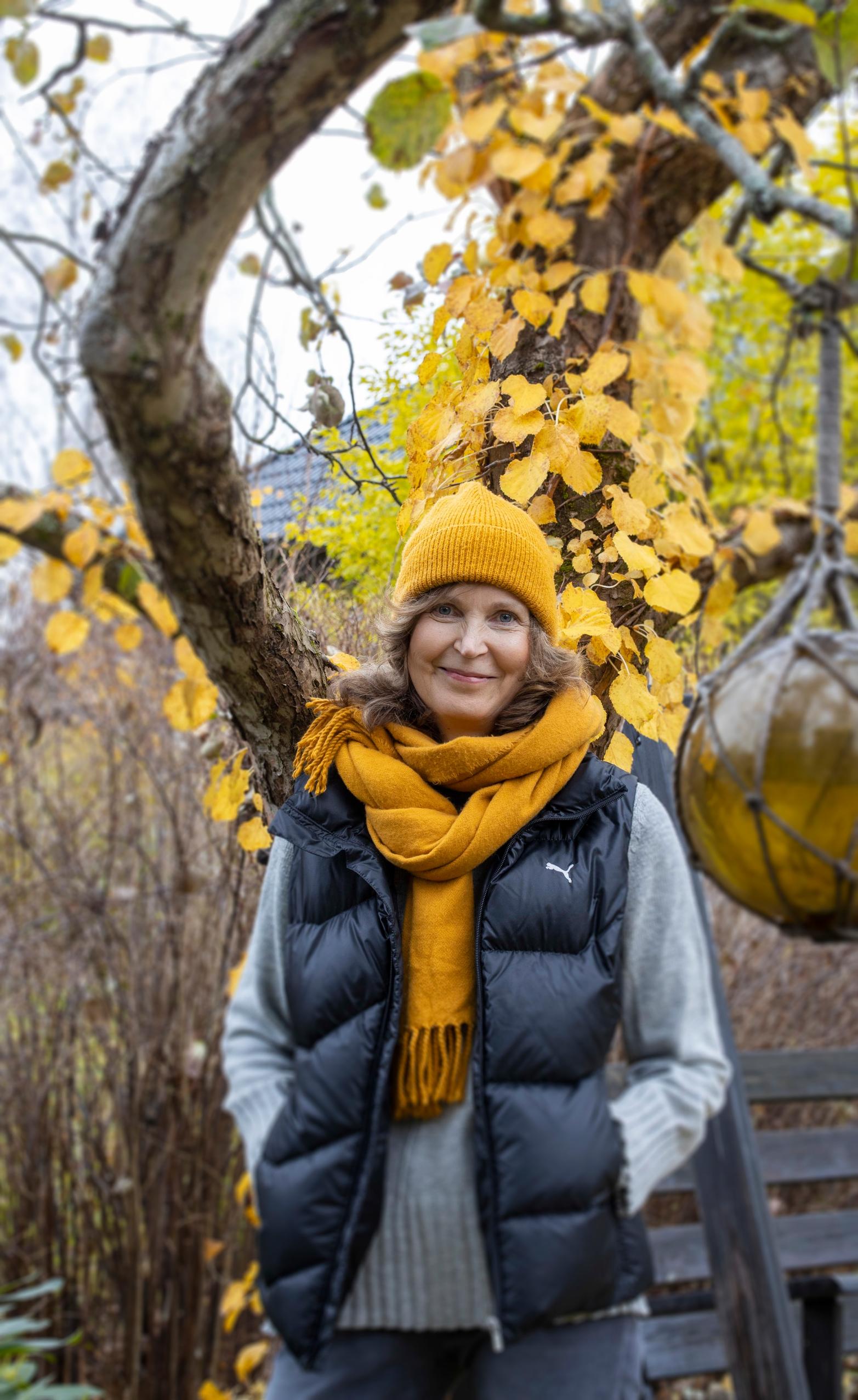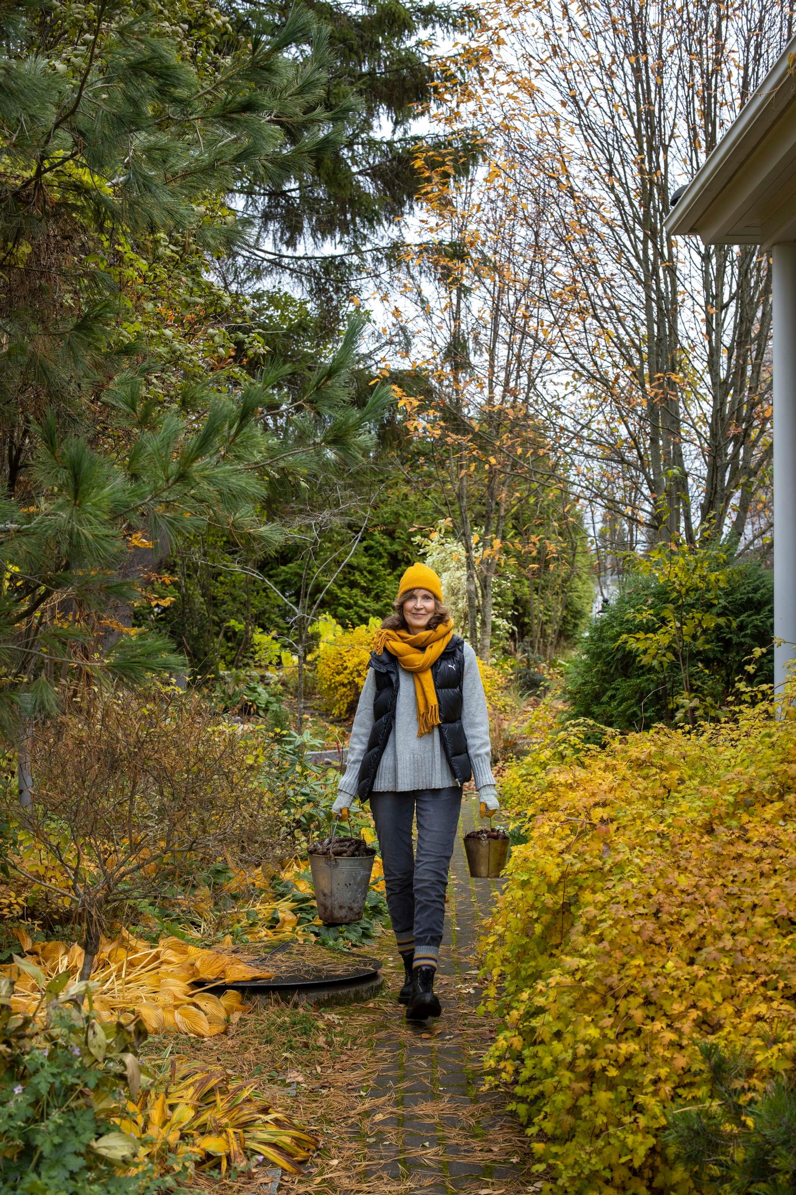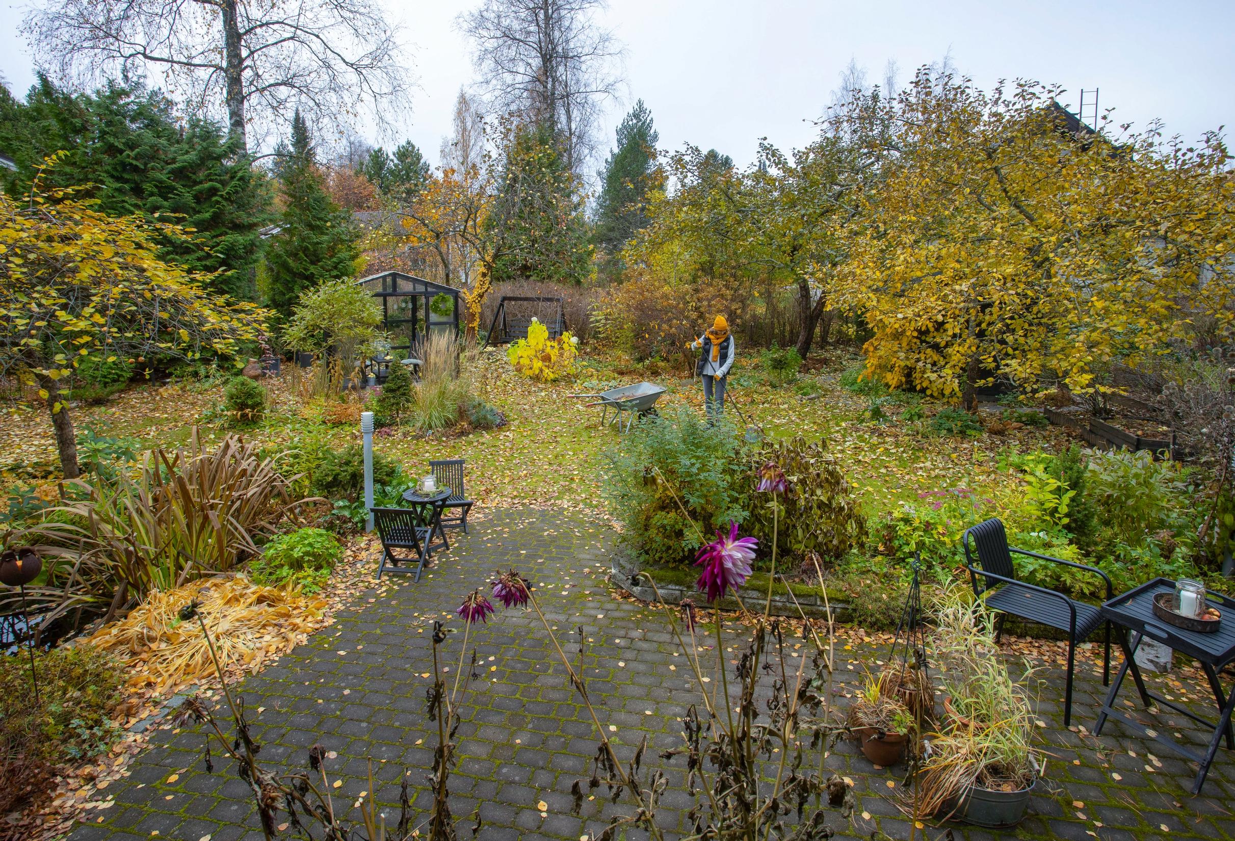 Golden-yellow birch leaves swirl in the wind as the temperature hovers near freezing. In Maija-Leena Kangasmäki’s garden, there’s a calm late-autumn atmosphere. The only sounds come from thrushes chattering in the trees and from the brisk swish of Maija-Leena’s rake as she sweeps leaves into perennial beds.