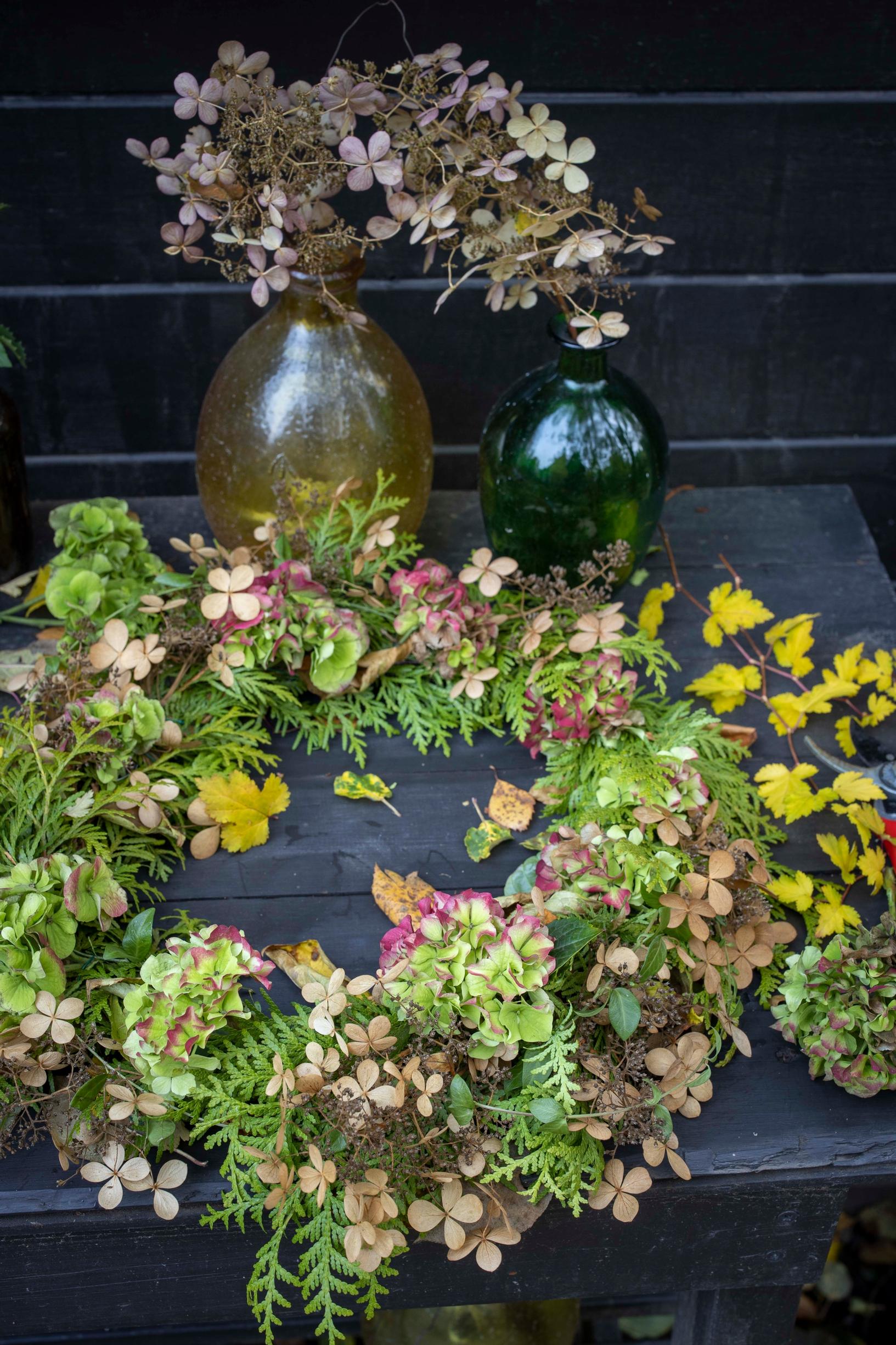 Small displays, bouquets, wreaths, and lanterns make a somewhat bare fall garden feel more inviting. You can often find materials for decorations right in your own yard. Clean out the greenhouse in the fall and set it up as a cozy spot for the darker season.
