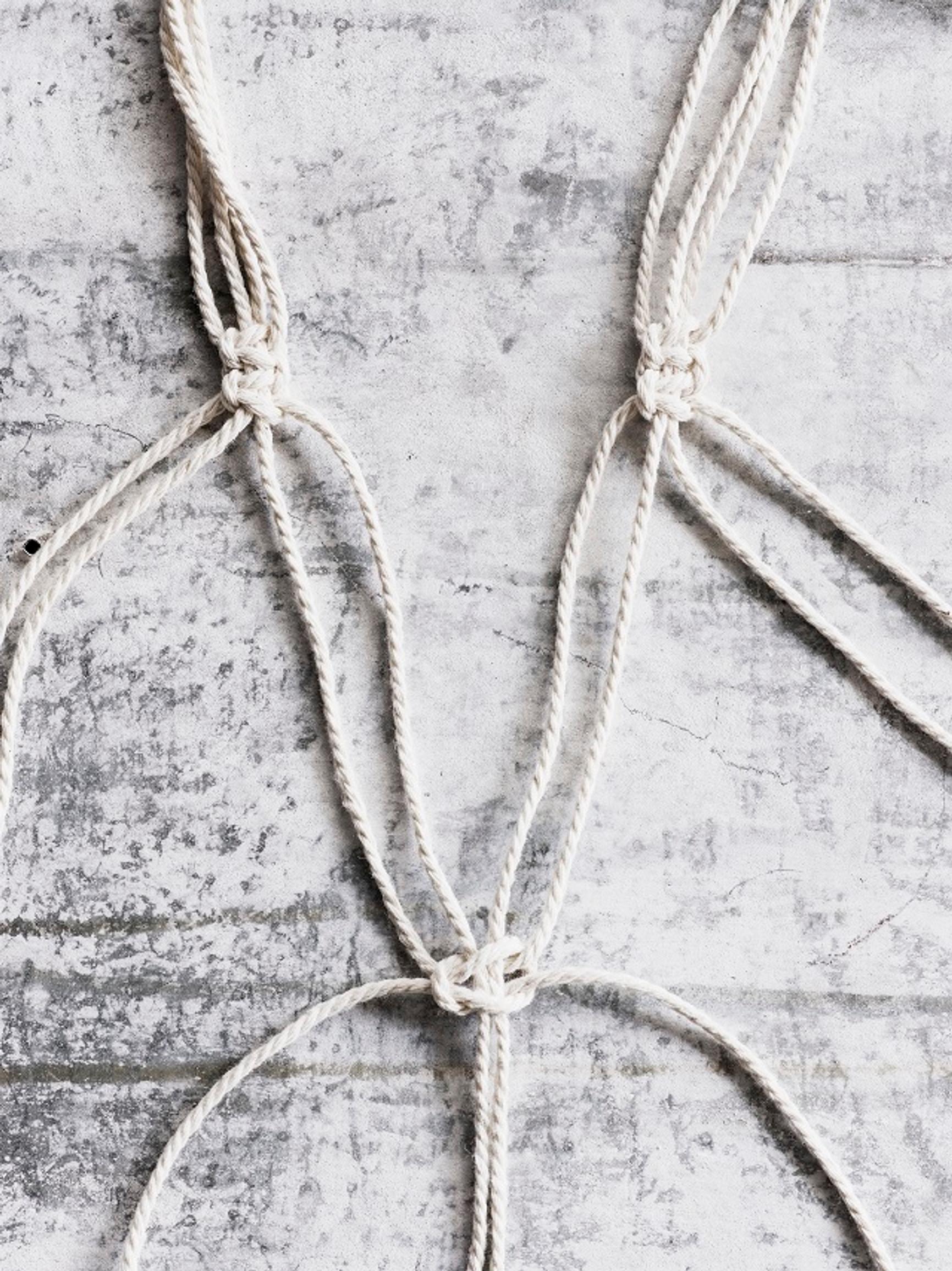 - Cut eight pieces of cord, each 4 meters long. Create a large loop at their center and knot it tightly. You will now have sixteen 2-meter cords hanging down from this loop knot, and the finished hanger will be hung by this loop. You will begin knotting down from this loop towards the base of the hanger.