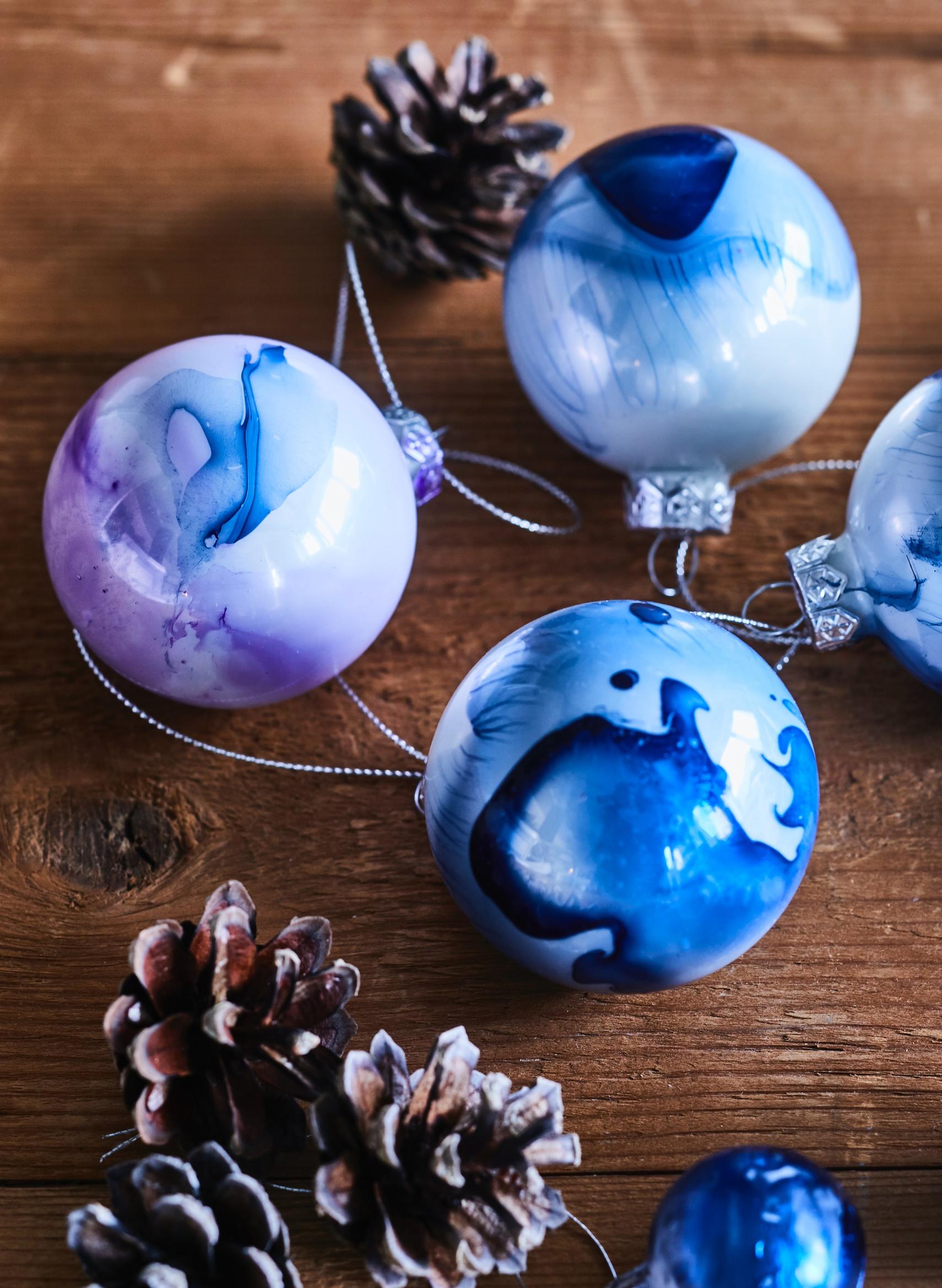 Make marbled Christmas ornaments that look like snow, ice, and distant galaxies