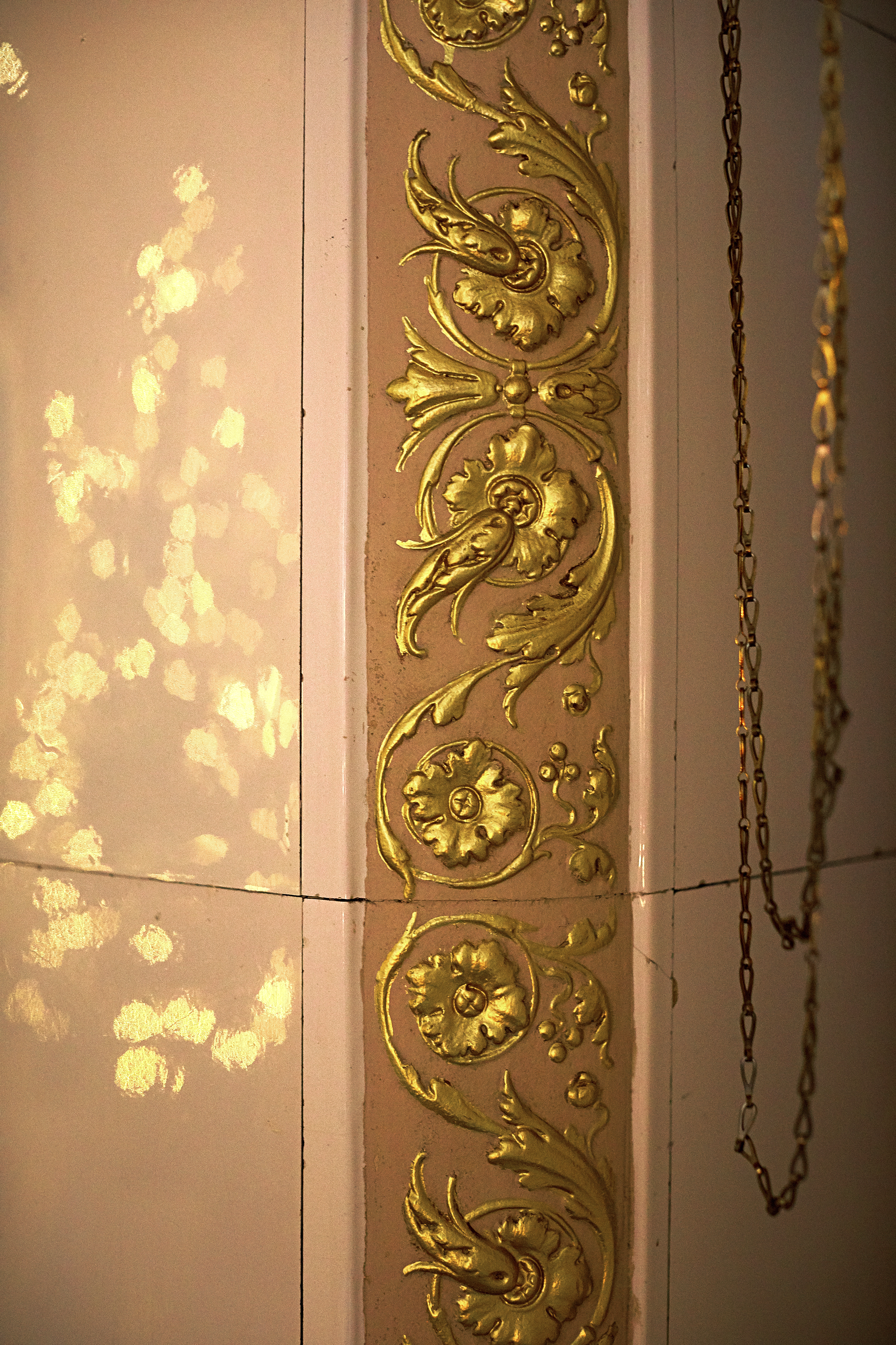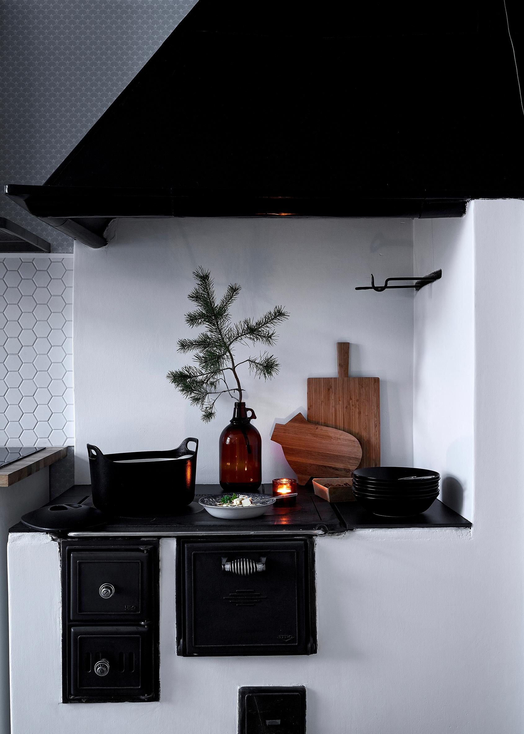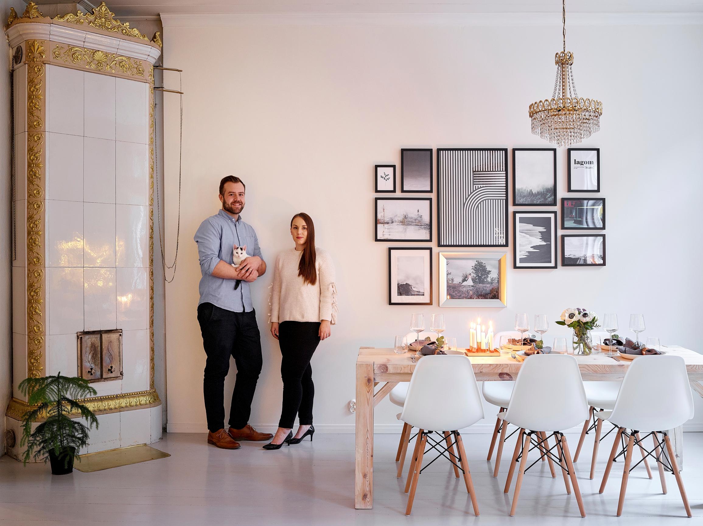 The young couple has only lived in their newly renovated wooden home for a short time. Its warm ambience comes from the living room’s log wall and the beautifully restored tiled fireplace. Maria and Joonas restored the tarnished gold paint themselves, and now it gleams alongside the lights on the Christmas tree.