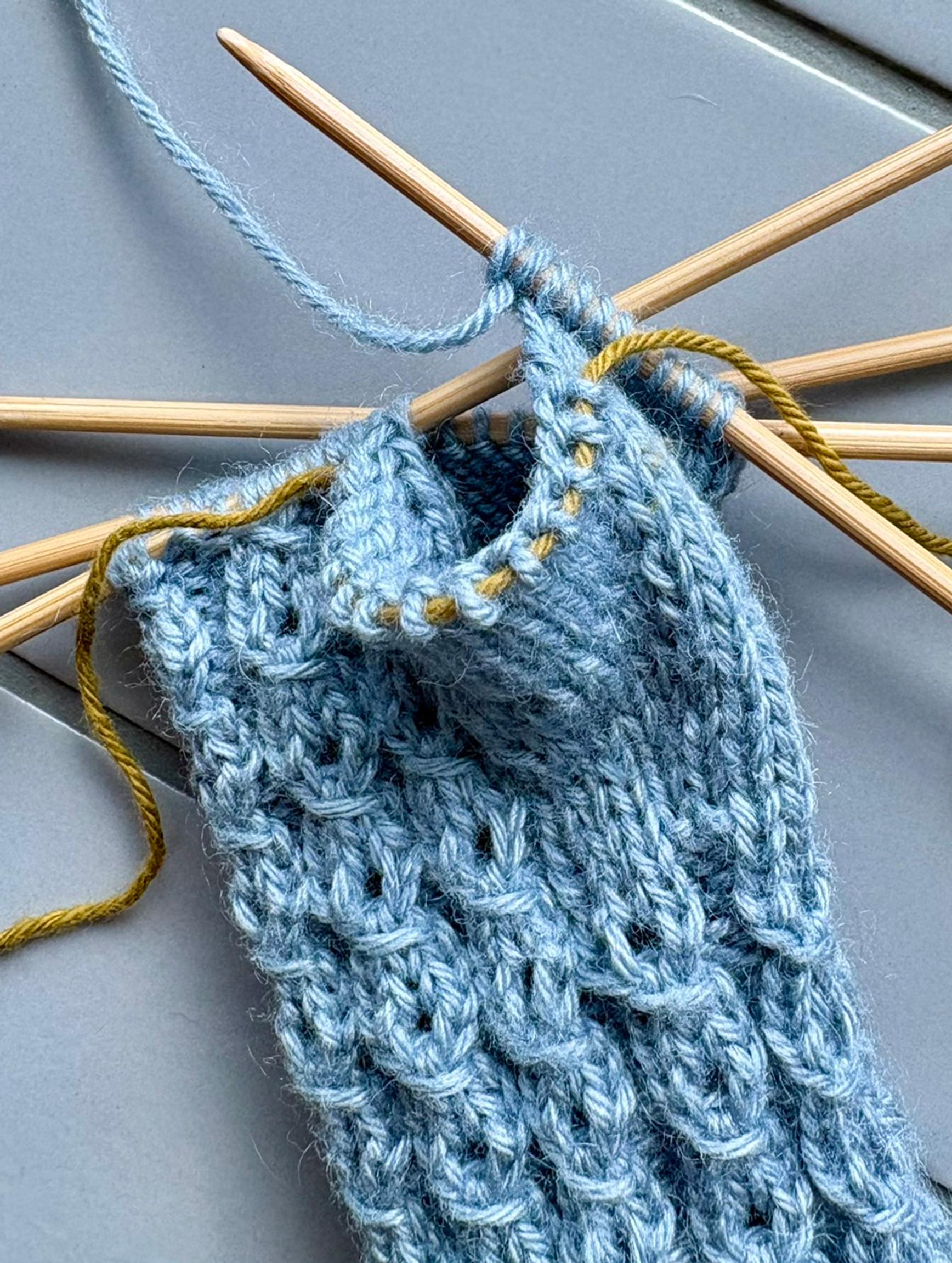 Knit 5 rnds of stockinette on needles 1 and 2 (the palm side) and continue the mock cable pattern on needles 3 and 4 (the back of the hand). From now on, p2 at the beginning of needle 3 before continuing the mock cable pattern to the end of the rnd.