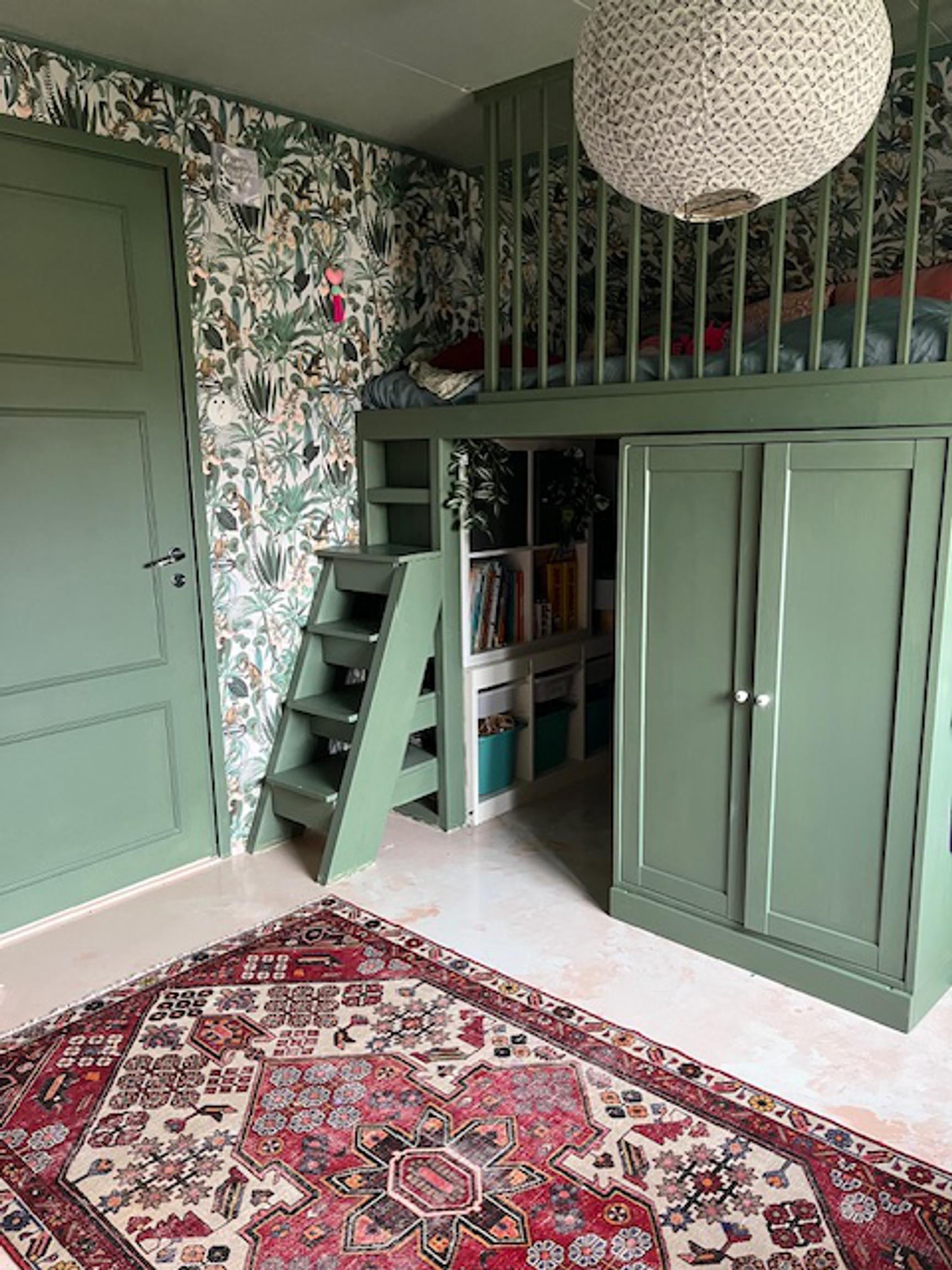 Suvi built a loft bed in a small schoolchild’s room, creating plenty of toy storage space.