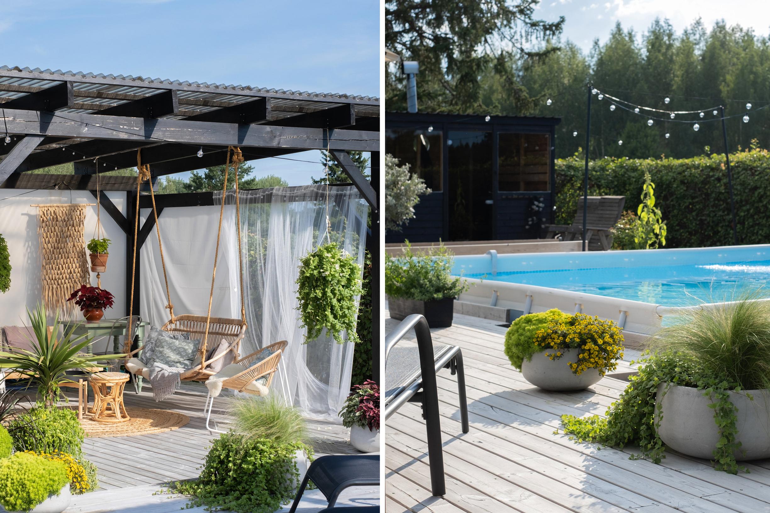 “It was just a tiny fenced-off pen,” recalls Netta, describing the couple of square meters (about 21 sq ft) of deck by her kitchen door. But now, when you walk out the door of the home she shares with her partner, Janne, you step onto about 100 m² (1,080 sq ft) of decking, complete with a swimming pool, a yard sauna, and a pergola furnished with rattan pieces. Lush greenery evokes the warmth of the southern sun.