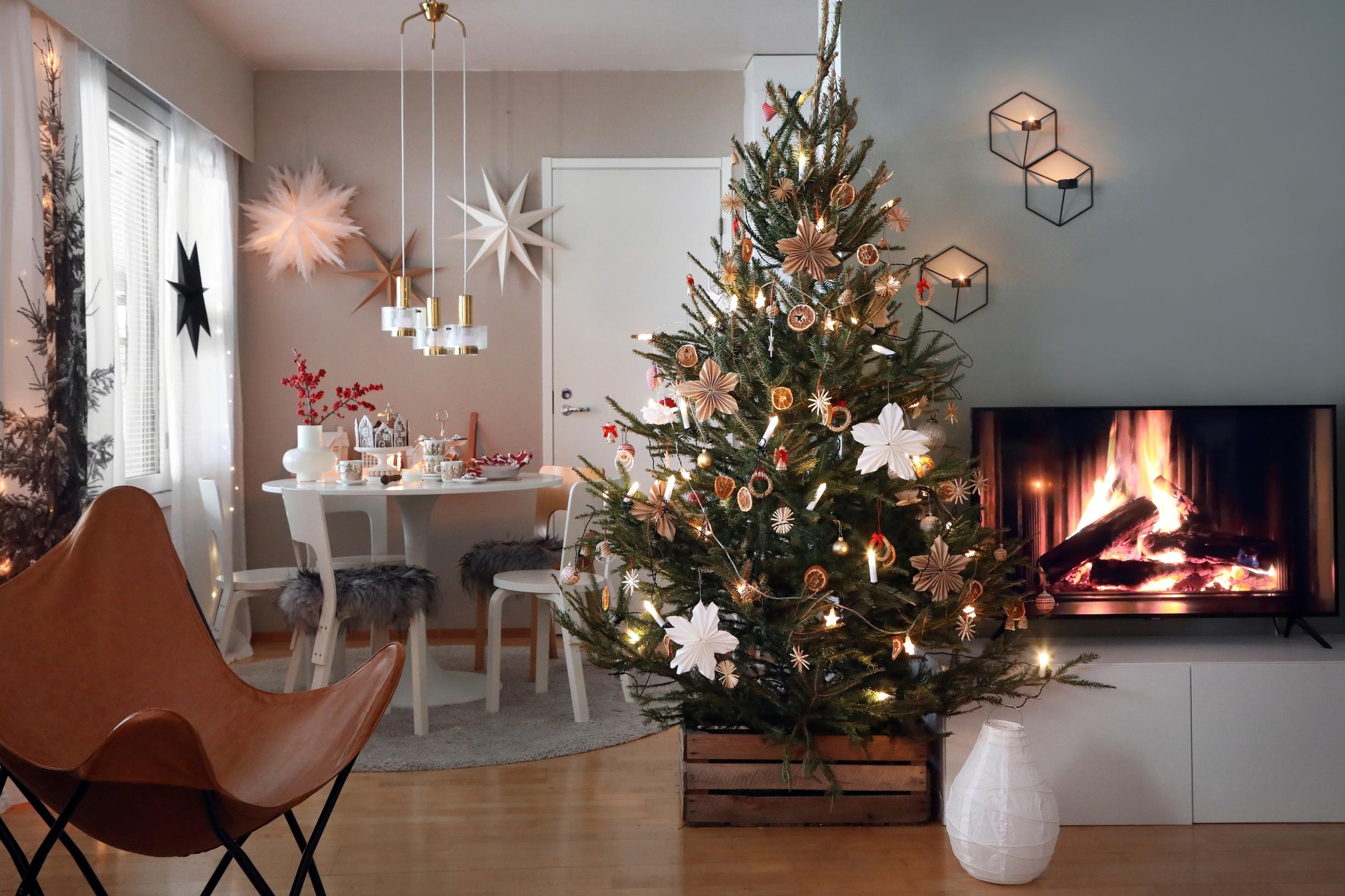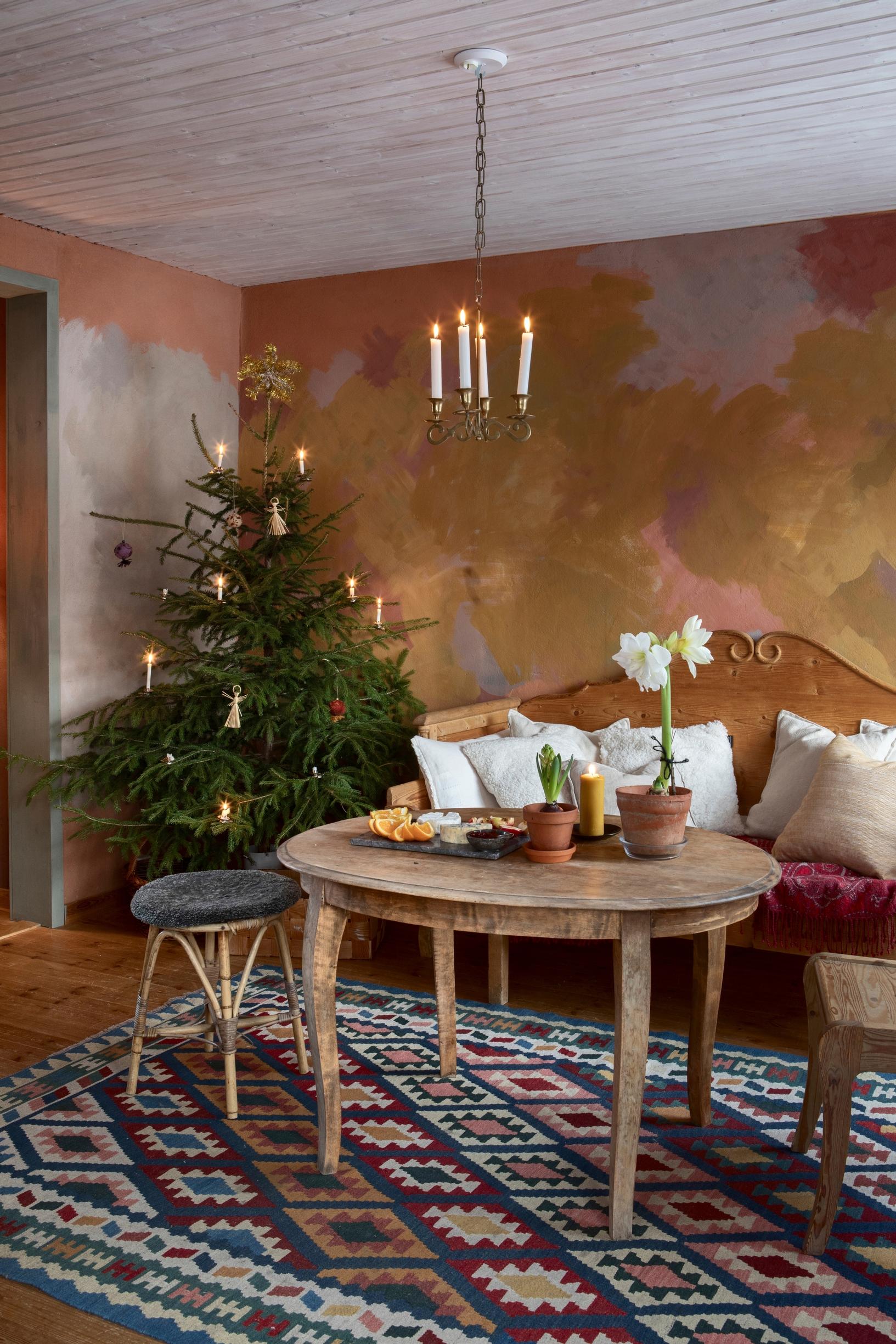 Natural materials, thrifted finds, and warm textiles frame Christmas beautifully. In a semi-detached house in Naantali, [in Finnish]the wall shows the homeowner’s clay-paint experiments. The tree is brought in from the nearby forest.