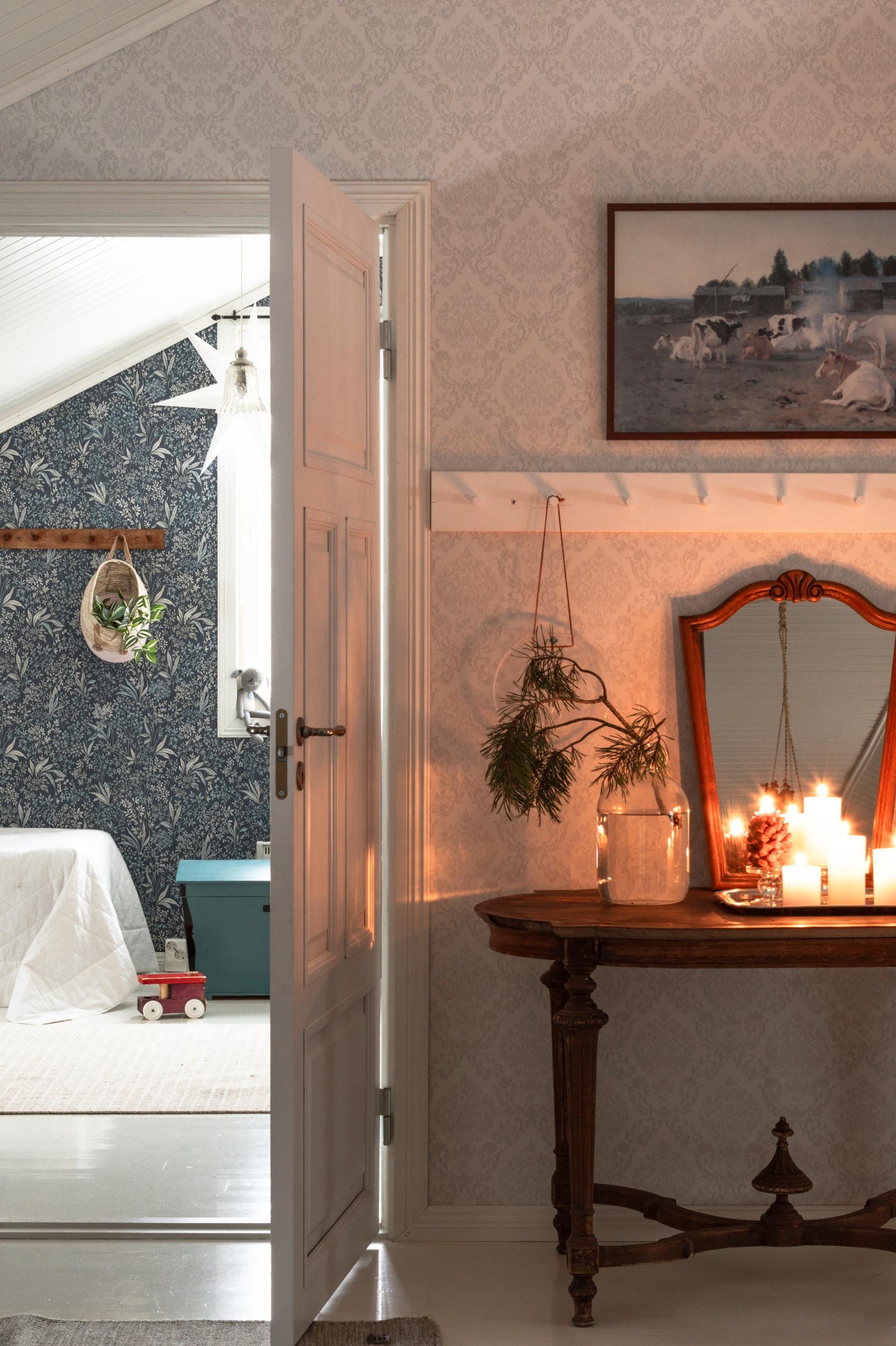 Every empty spot holds a candle arrangement or a bowl of treats. If you want twice the glow, place a mirror behind the candles. The kids’ room in the background is papered in Boråstapeter’s blue-toned Nocturne wallpaper. The mirror is a flea market find.