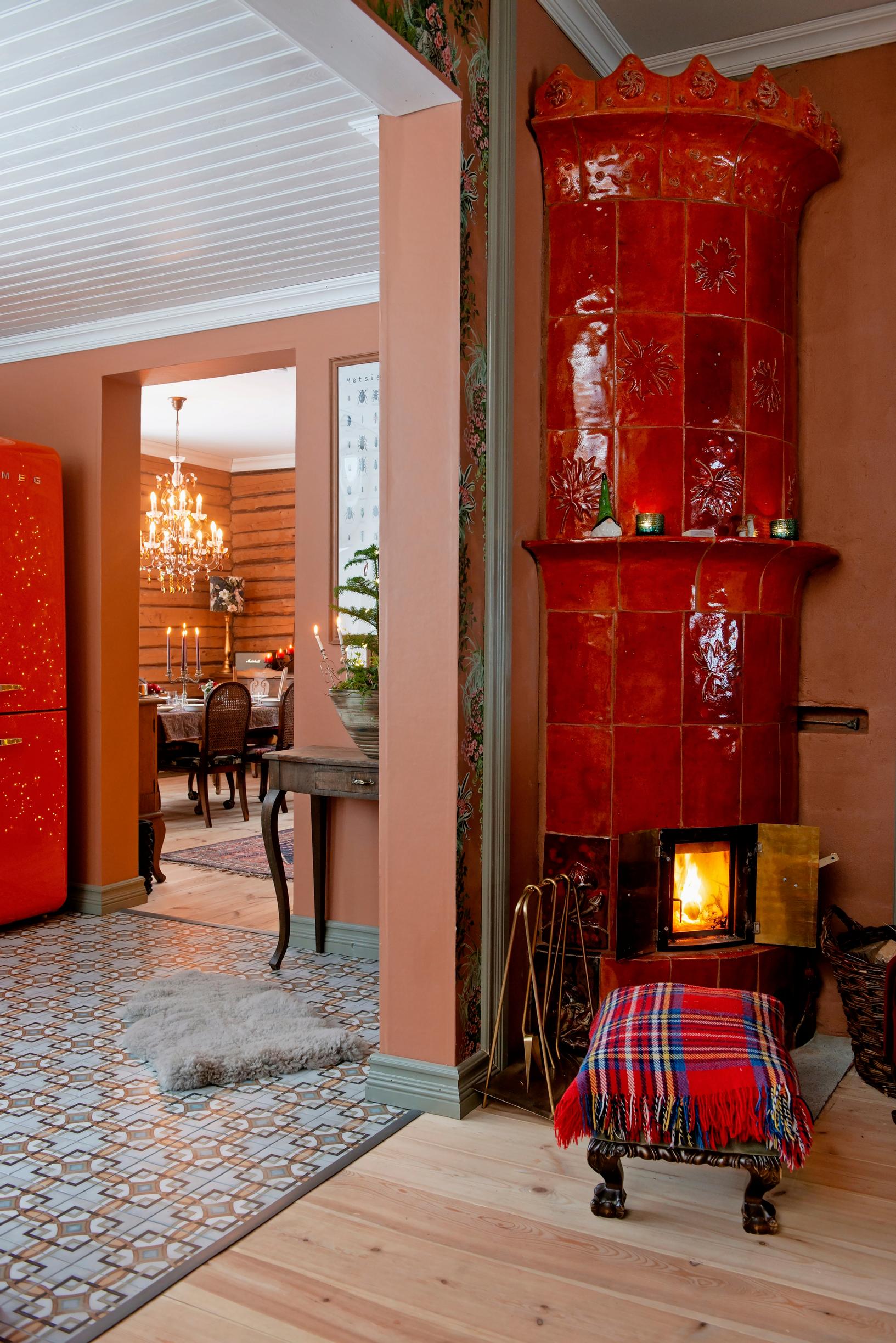 An orange-red tiled stove welcomes you in the entryway of this 1850s log house. There’s room for plenty in this Loviisa home—including three Christmas trees. The ambience and warmth of a live fire are second to none. Layered, cozy styling and beautiful details set the tone.