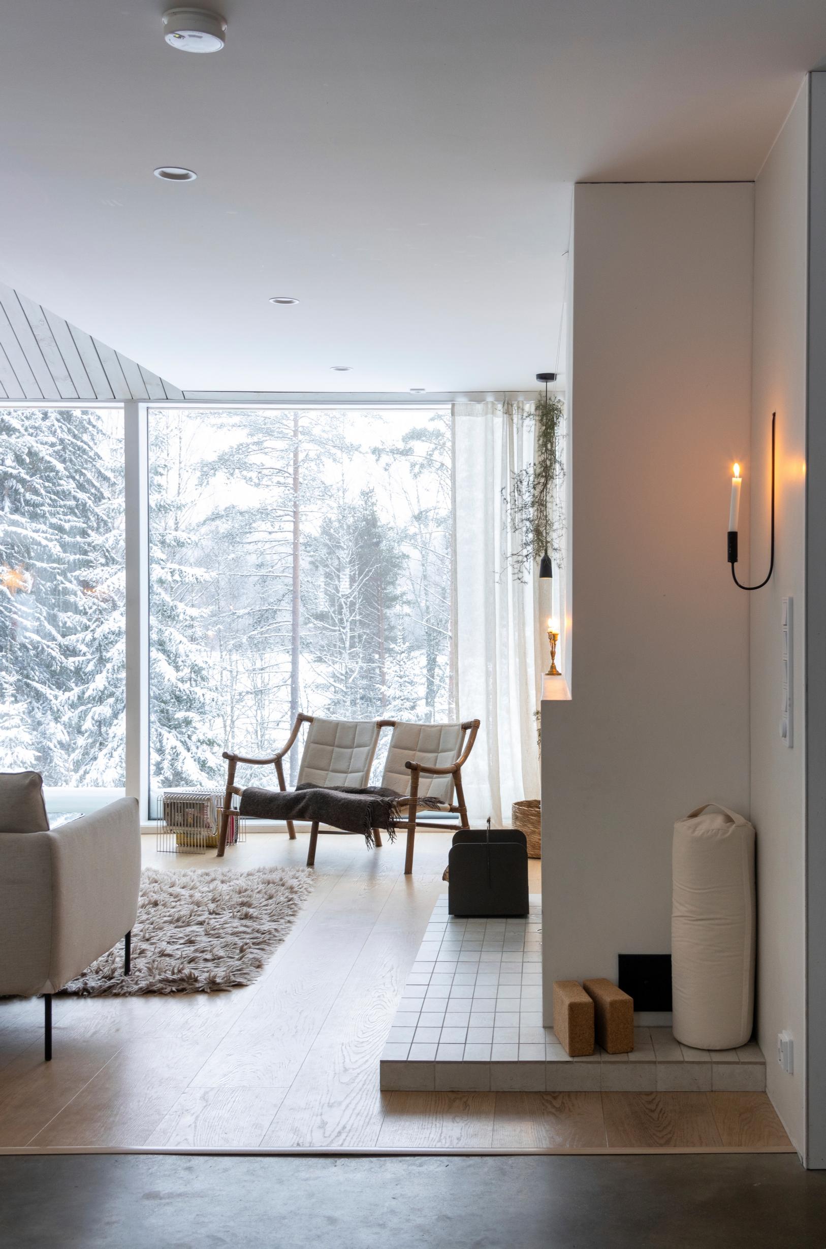 The location is ideal in other ways too: Samuli has a short commute to work and the children to school. Even closer is Johanna’s own workspace. In a room built into a separate wing, she works as a Kalevala bone-setting practitioner and wellness professional. She has also used their spacious living room to host a yoga event.