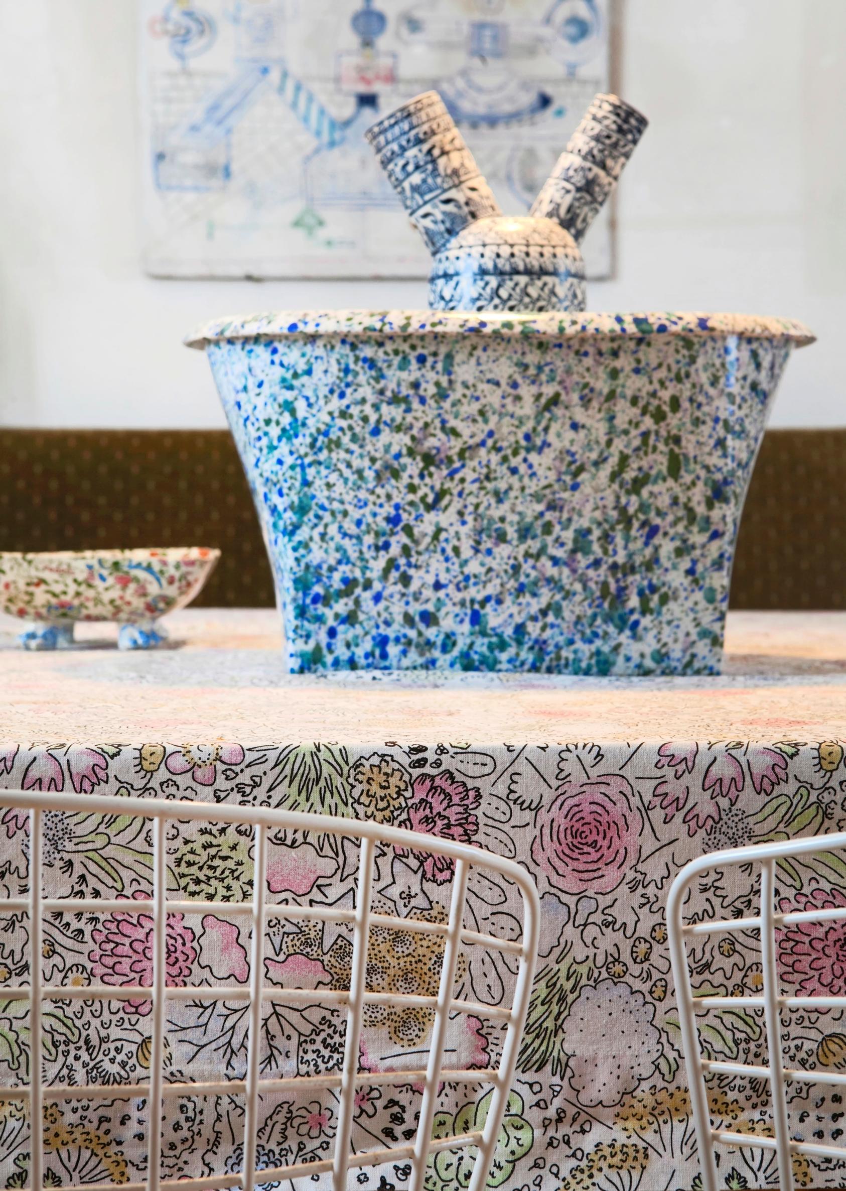 Arabia had bought Rörstrand in 1983, making it part of Wärtsilä. The following year, Oiva once again collaborated with the Swedes, resulting in a collection called Coboltissimo. These simple molded platters and jars featured Oiva’s hand-painted cobalt-blue elements, while Rörstrand’s ceramicists formed the pieces.