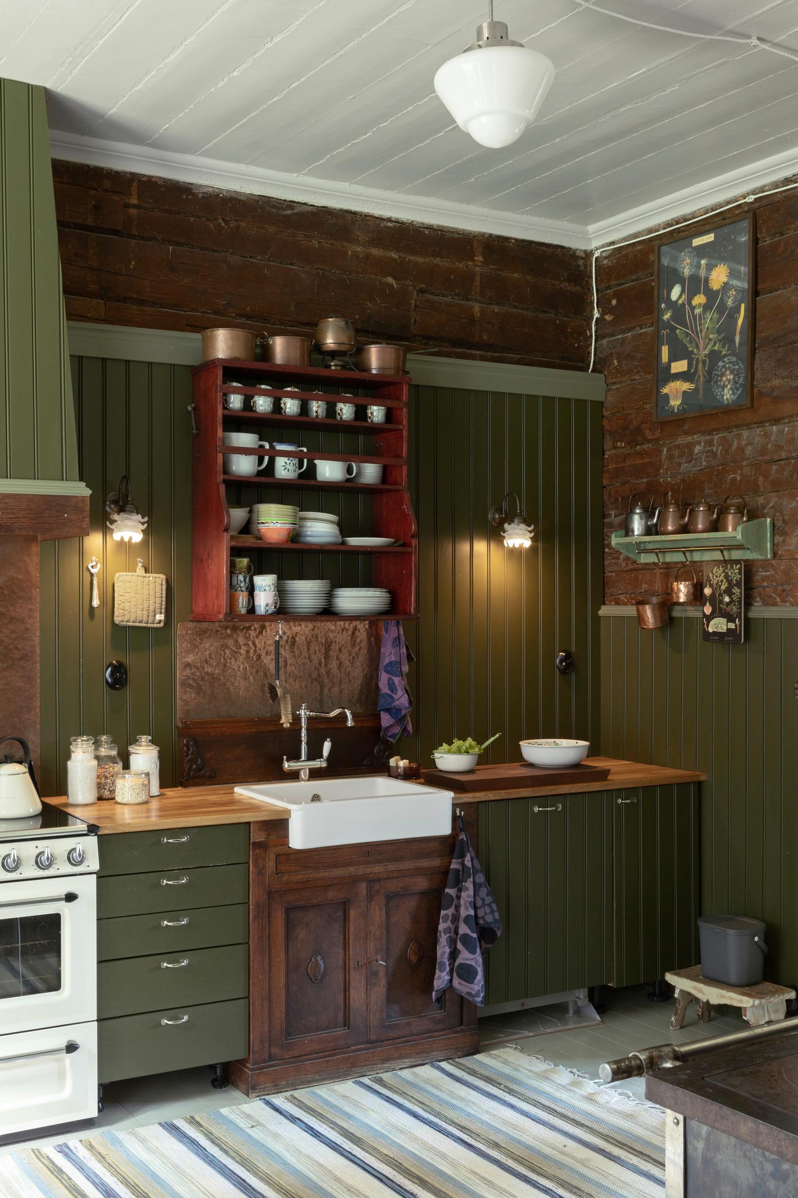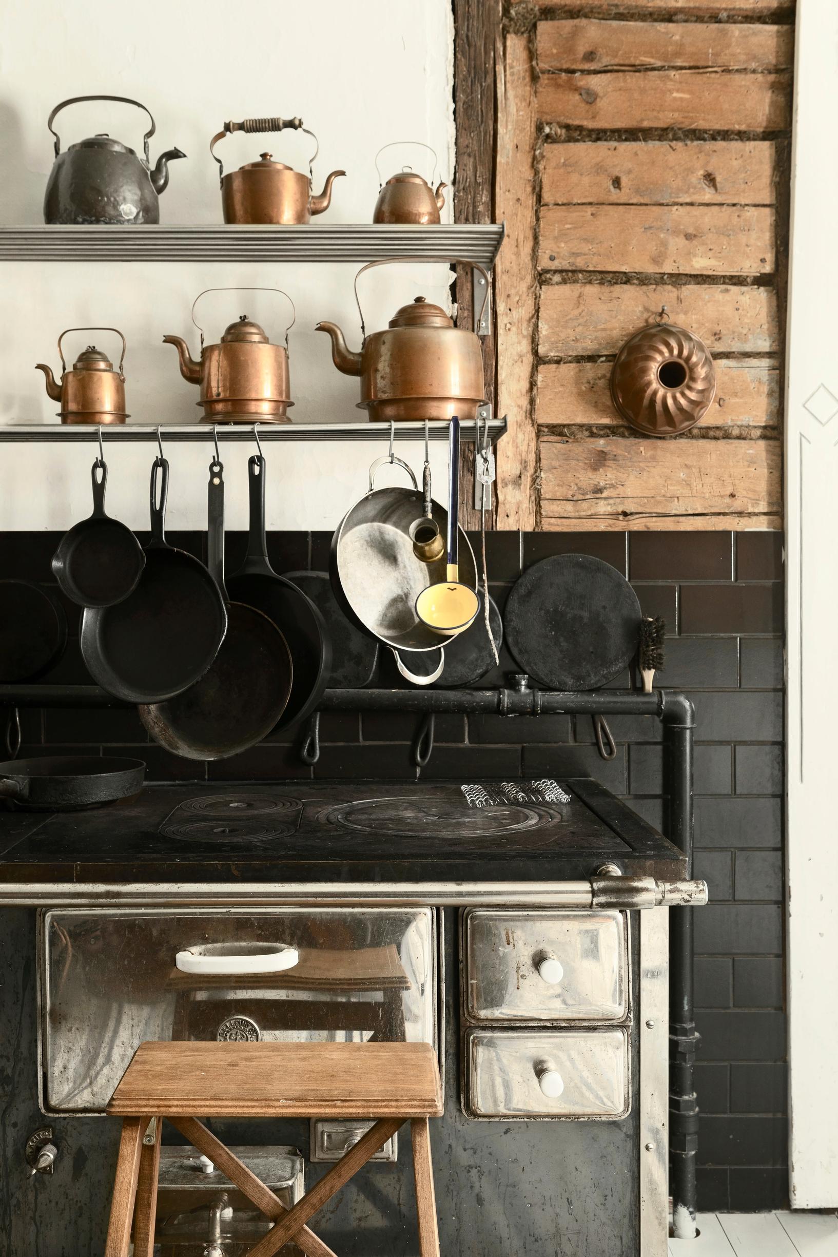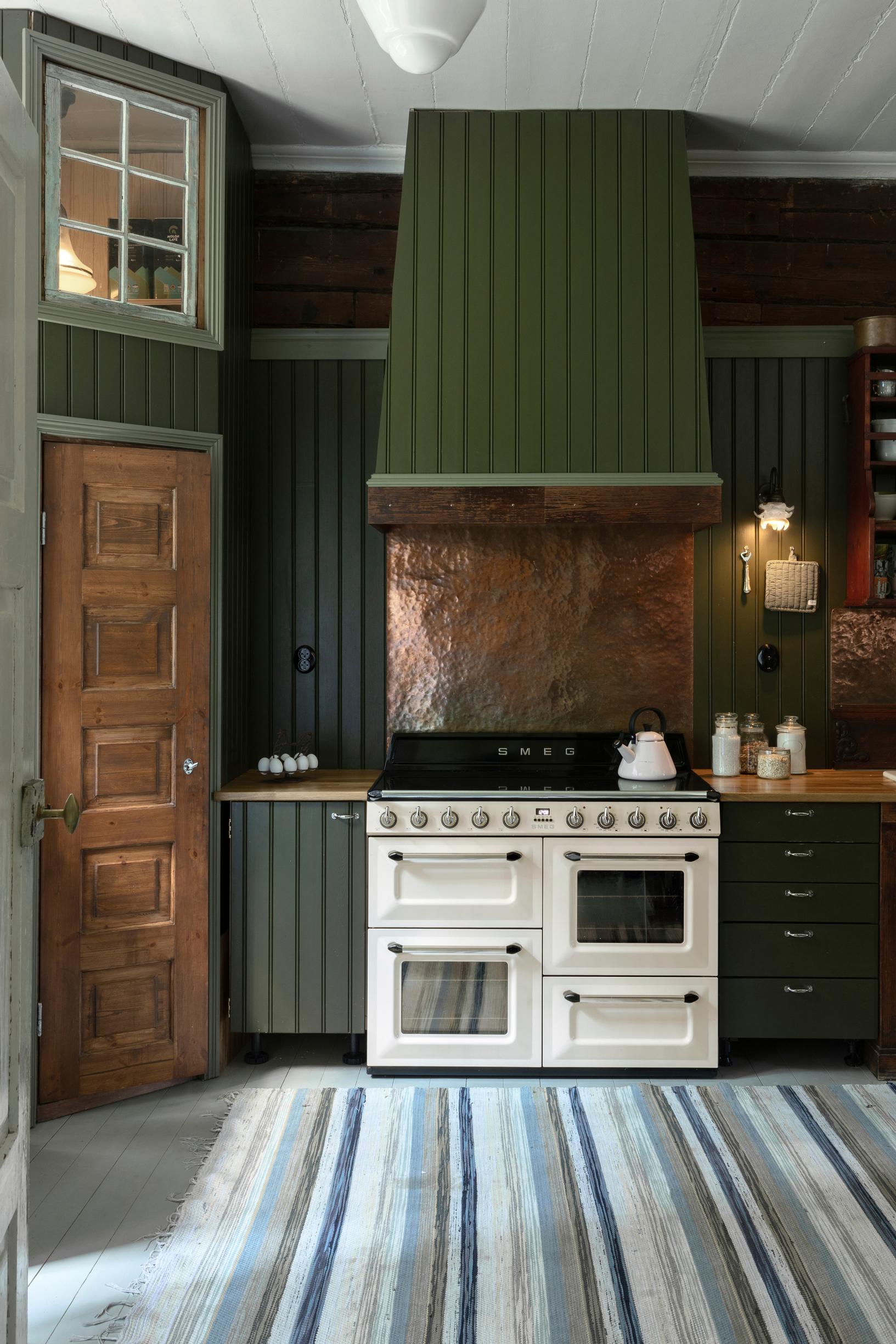 The most stunning details are the backsplashes behind the sink and stove, which Jussi made from copper sheets. He hammered them himself to achieve the lively surface.