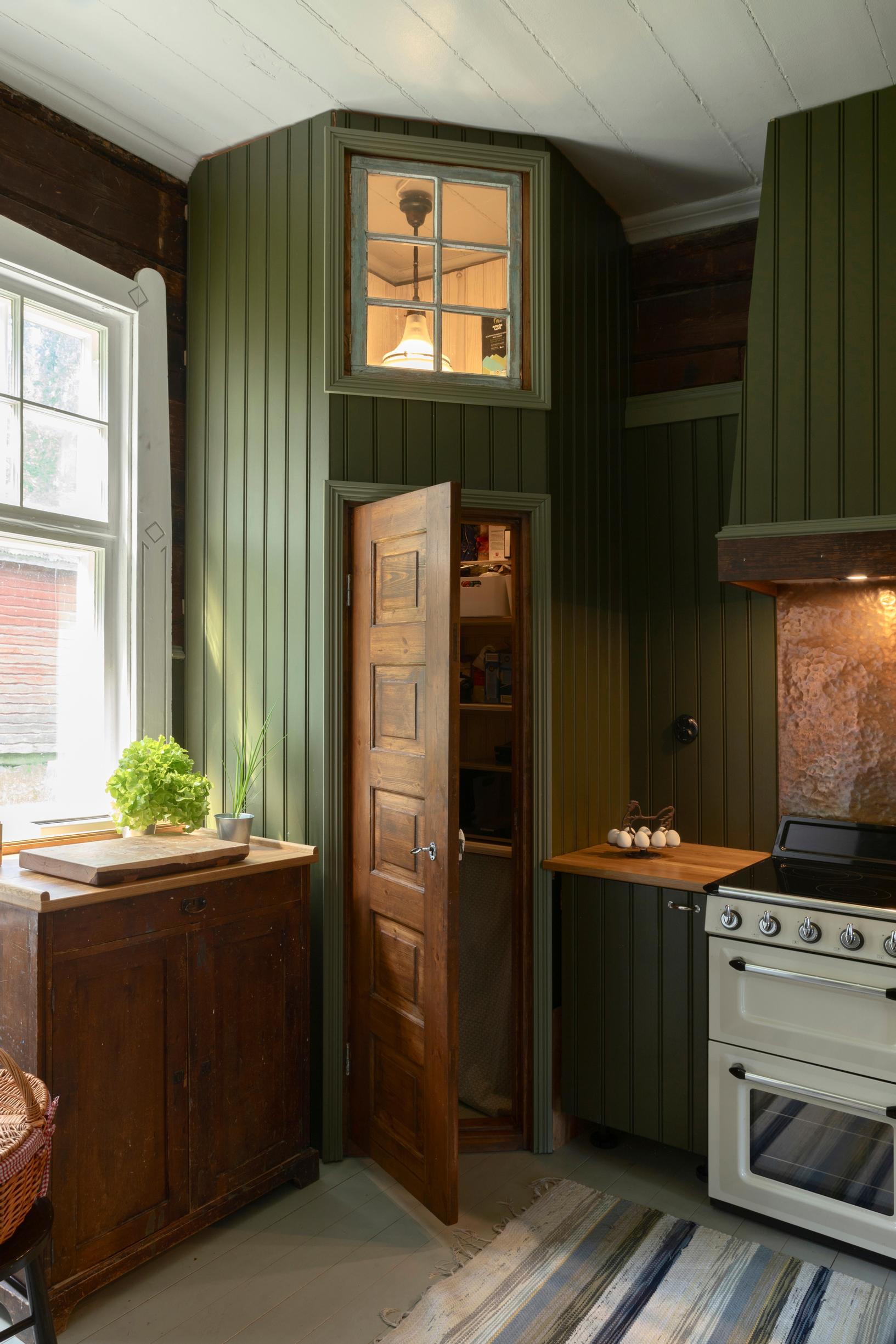 They covered the door recesses with wood to prevent mouse damage. The wall was leveled, and 12-millimeter spruce plywood was screwed on as backing for the cabinets and paneling. The final surface is beadboard paneling, which was also used to cover the new corner pantry. An old chest was repurposed as the sink cabinet. Jussi made the cabinets himself from glued laminated timber.