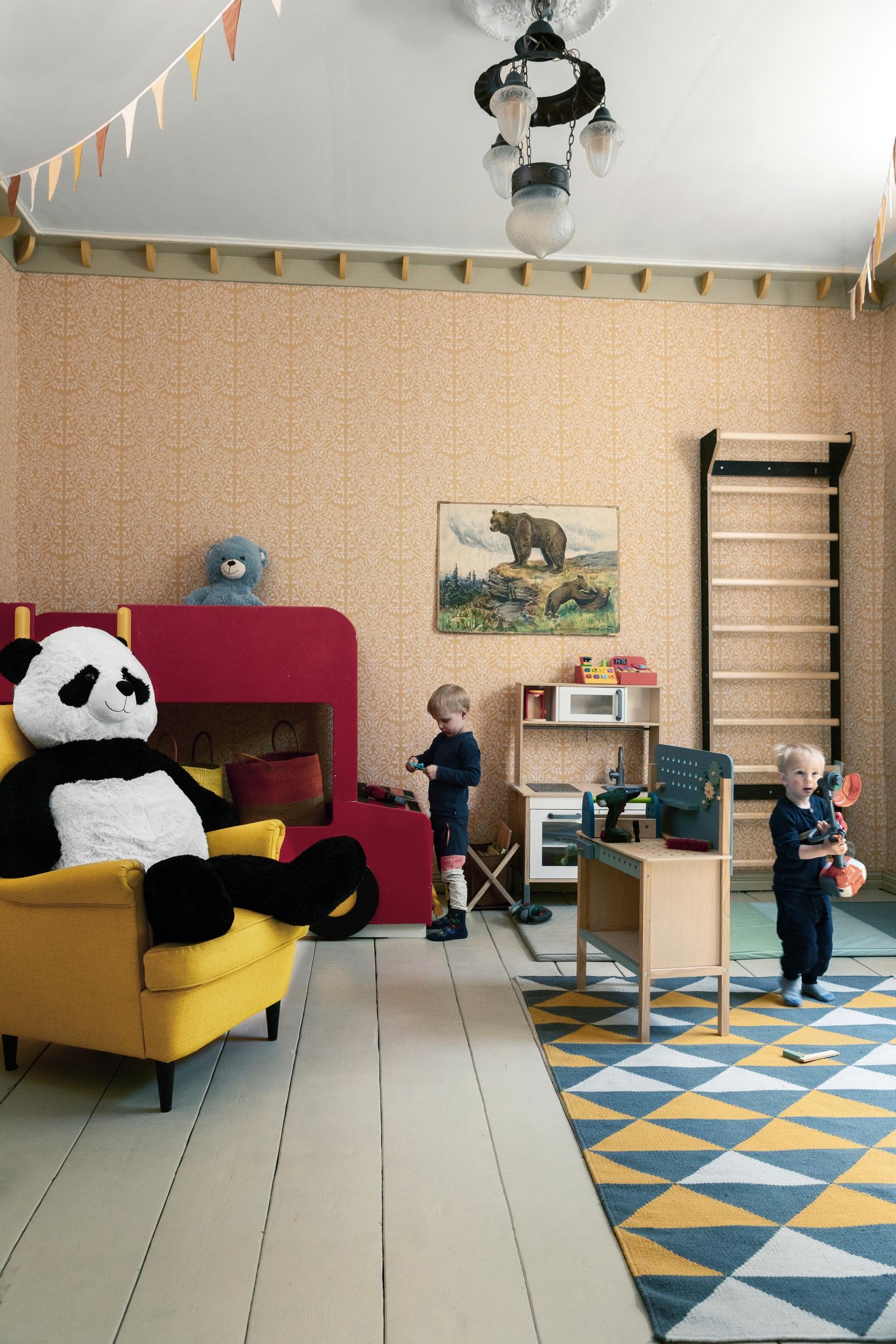 Three sturdy beams divide the main room ceiling into four sections. The vaulted ceiling looks like it could belong to an even older building. Was the ceiling perhaps inspired by historical design in the spirit of national romanticism?