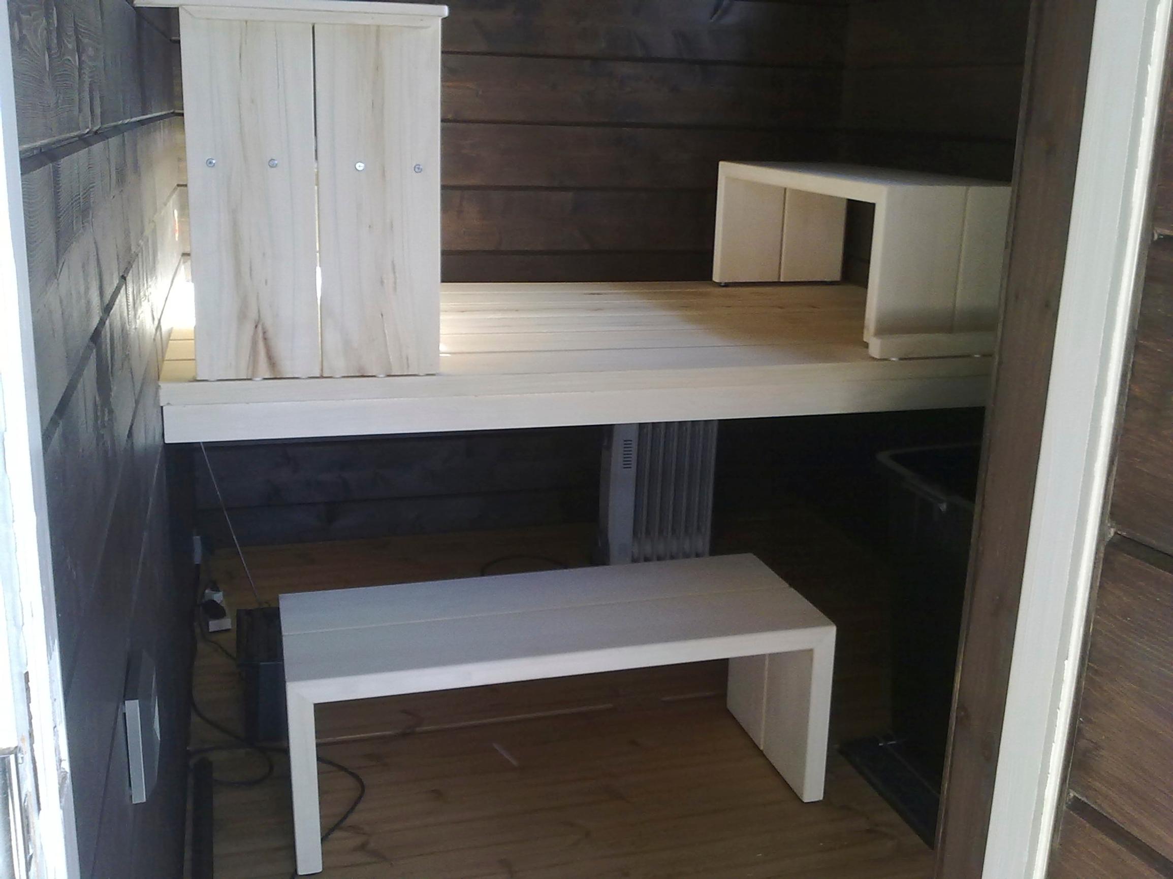 The couple wanted their new sauna to evoke the feel of an old log sauna, so Arto installed log-style paneling on the walls. A double application of sauna sealant gave them a weathered look. The benches were planed to order into wide boards.
