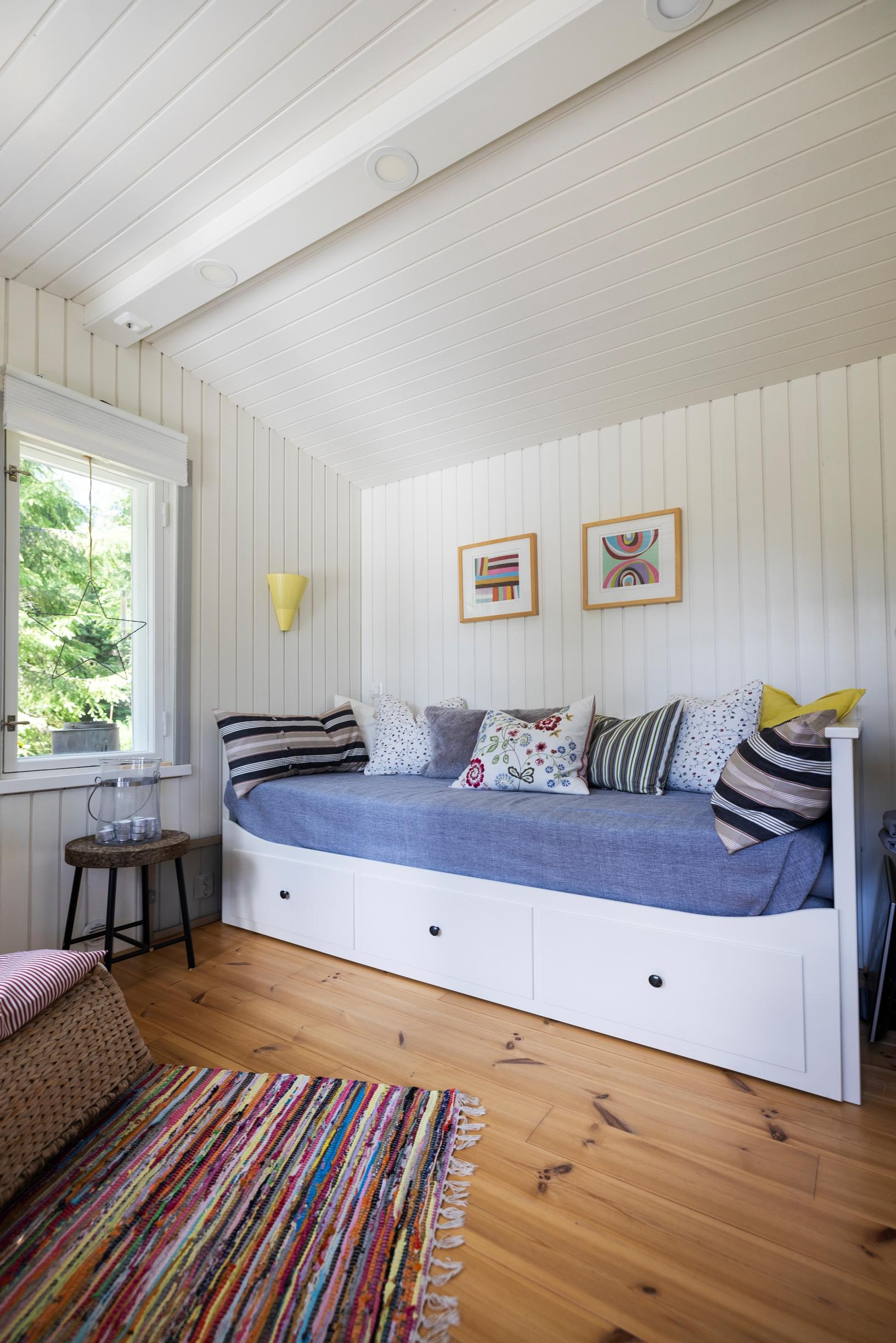 The lounge worked well as extra space and served as a temporary living area while the couple later renovated their cabin. A particularly practical feature is the abundance of electrical outlets.