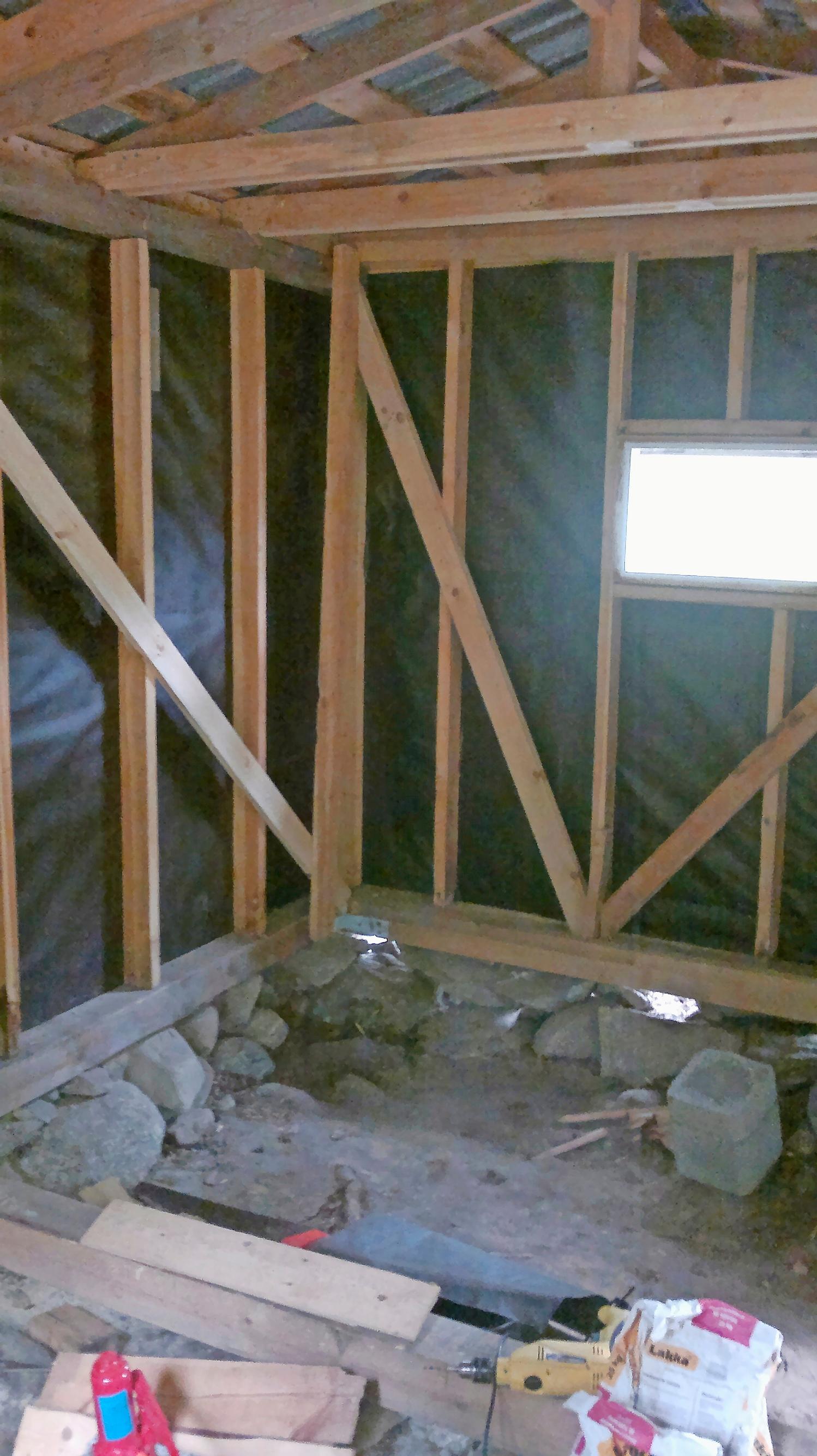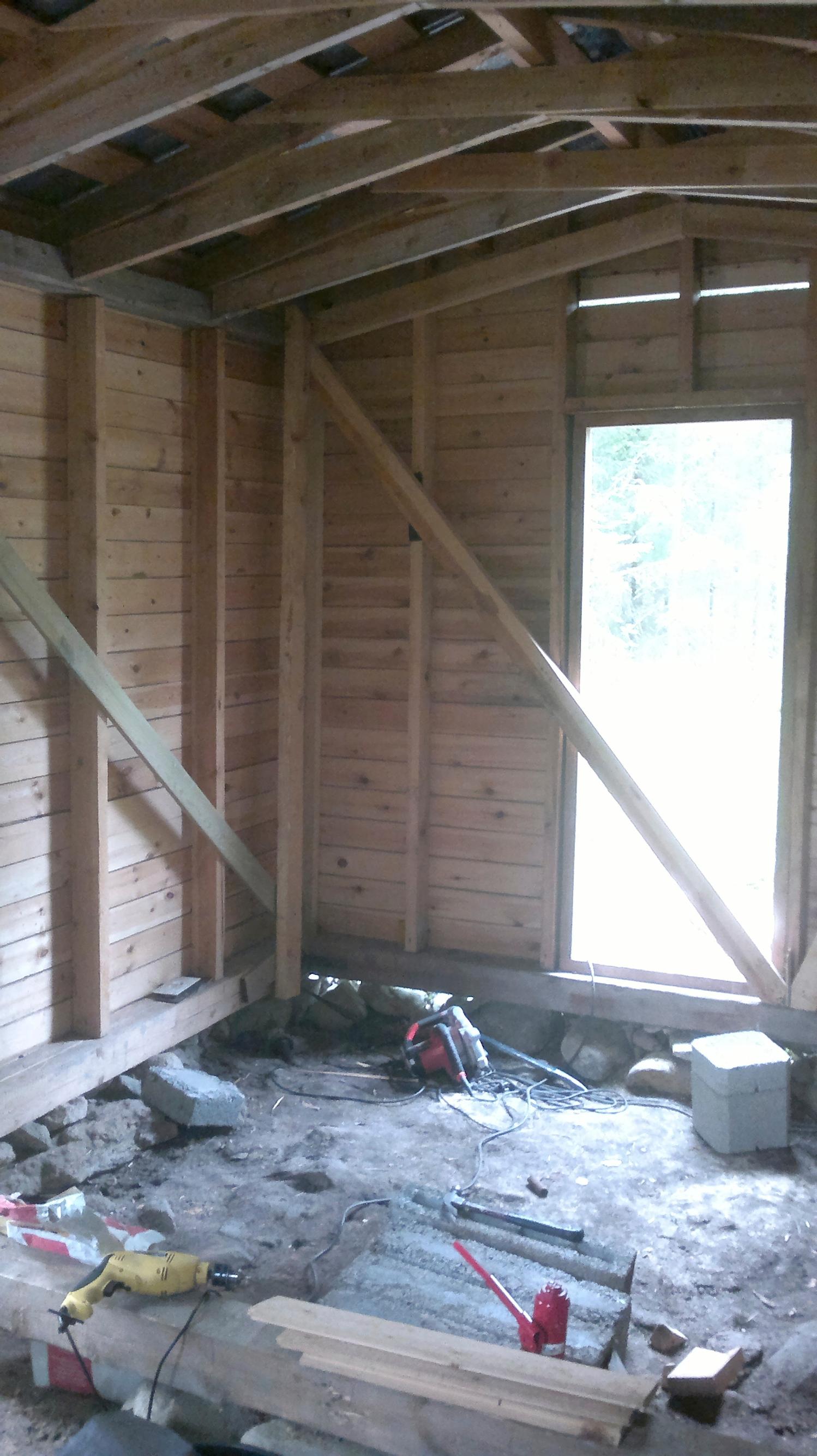 The rocky site is inaccessible to heavy machinery, so to correct the tilt, Arto manually raised the building by ten centimeters. Now it rests on blocks anchored to the bedrock. The exterior still leans a bit, but Arto leveled all the interior surfaces and structures.