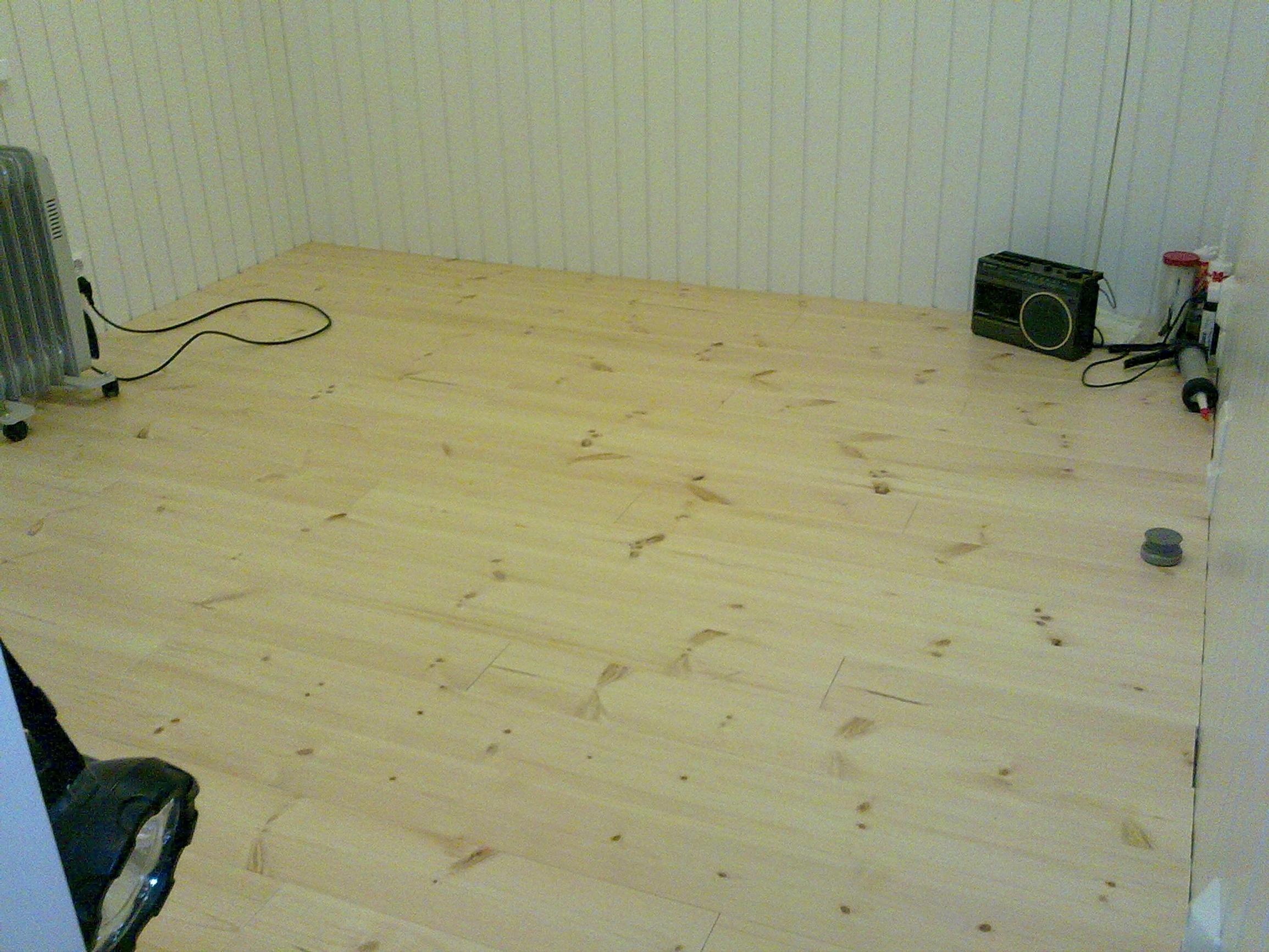 The sauna floor is now made from heat-treated tongue-and-groove boards. Arto laid them crosswise, contrary to usual practice.