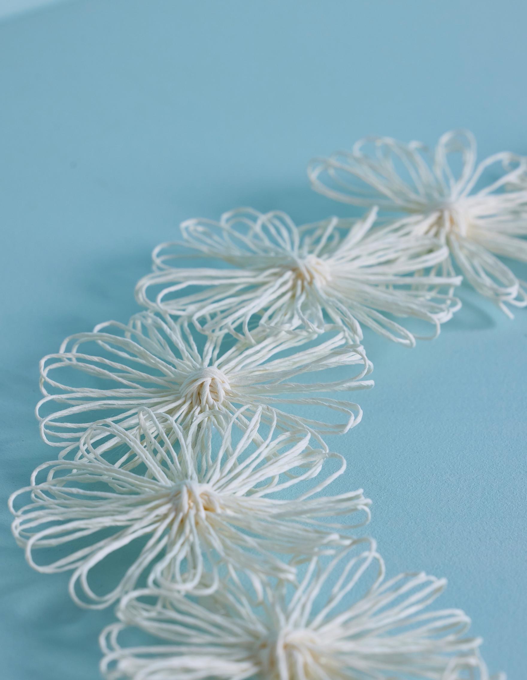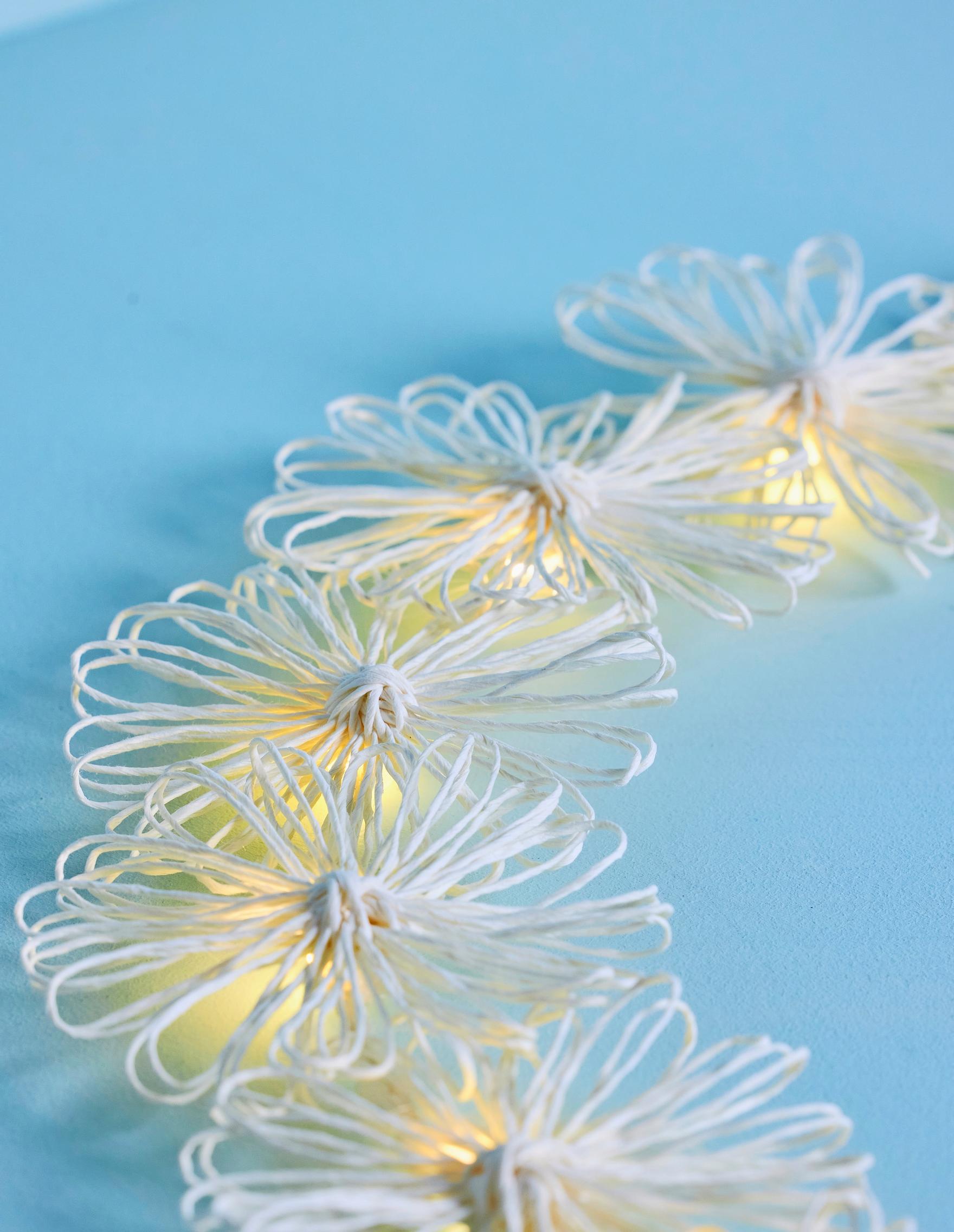 Wind paper twine into flowers—it’s incredibly easy on a loom ring. Attach the blooms to a wreath form, thread in a string of lights, and hang it in a window or on the wall.