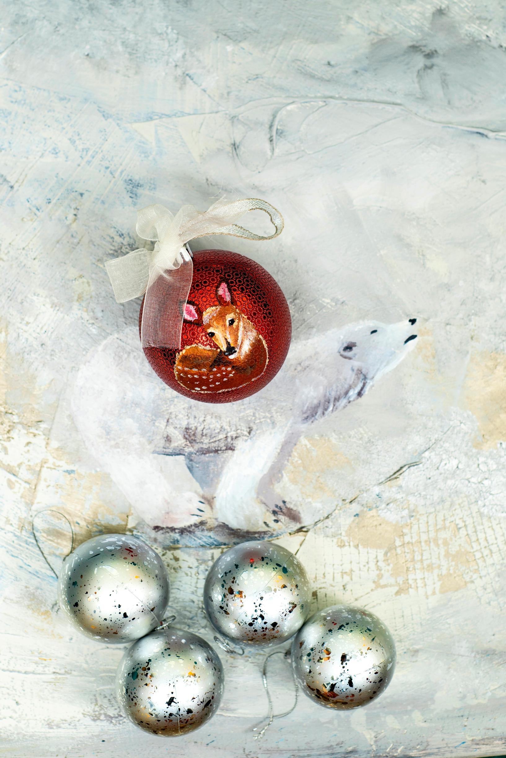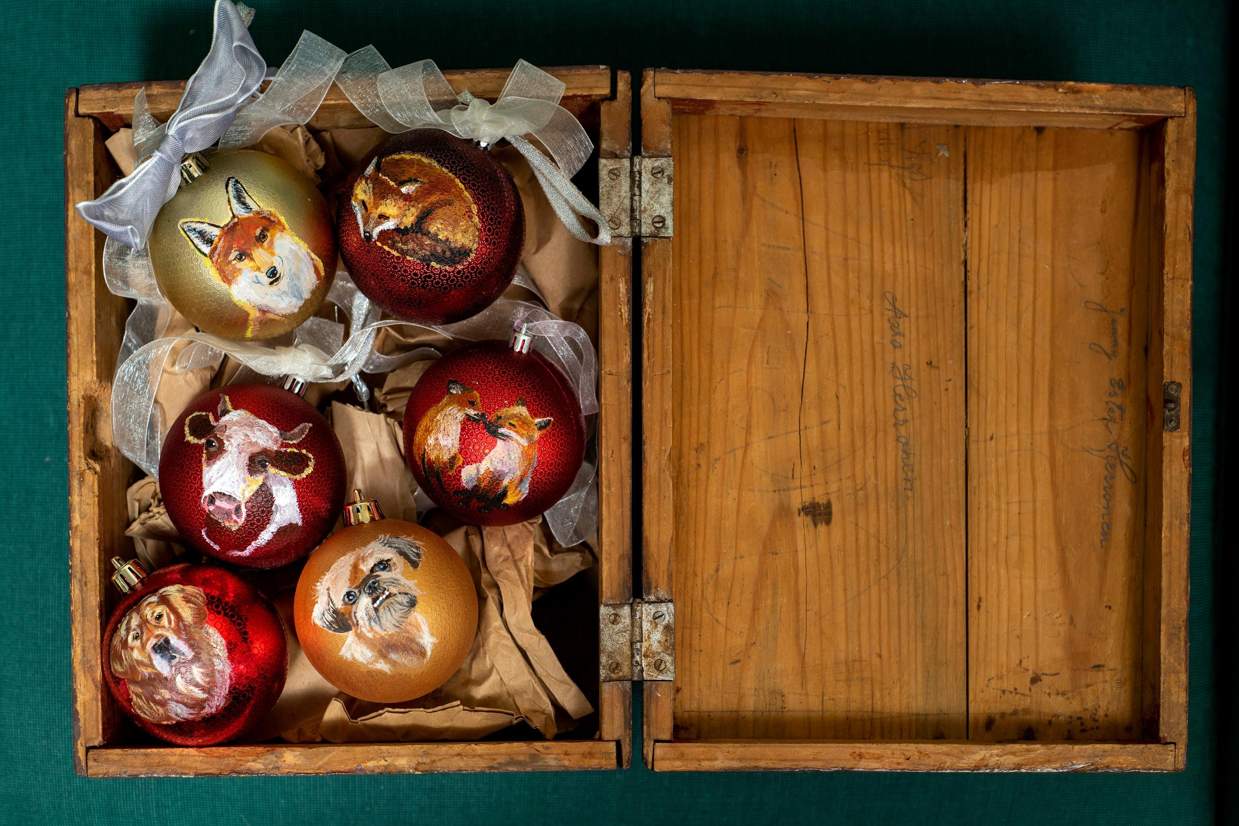 I’ve always enjoyed experimenting with different techniques, materials, and surfaces in my art. I’m not sure exactly where the idea to paint Christmas ornaments came from, but I’ve likely painted over a hundred so far. At first, I painted landscapes, but soon I began painting animals, which feels more natural to me as a visual artist. The cats and dogs in our family are always my first subjects when I’m testing new surfaces.
