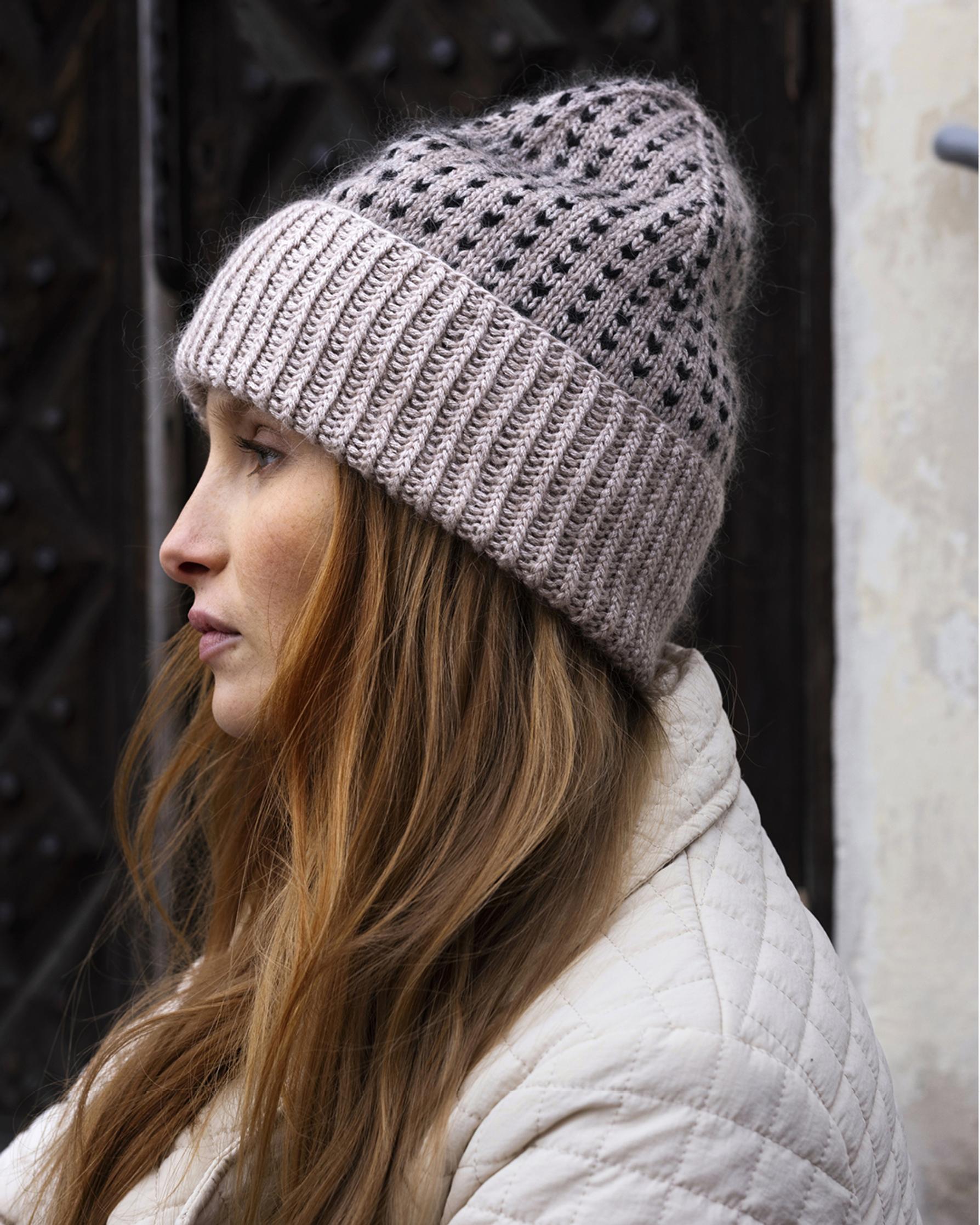 This speckled beanie is inspired by the charming Pihlgren & Ritola wallpapers. The graphic minimalism pairs nicely with many different outfits.