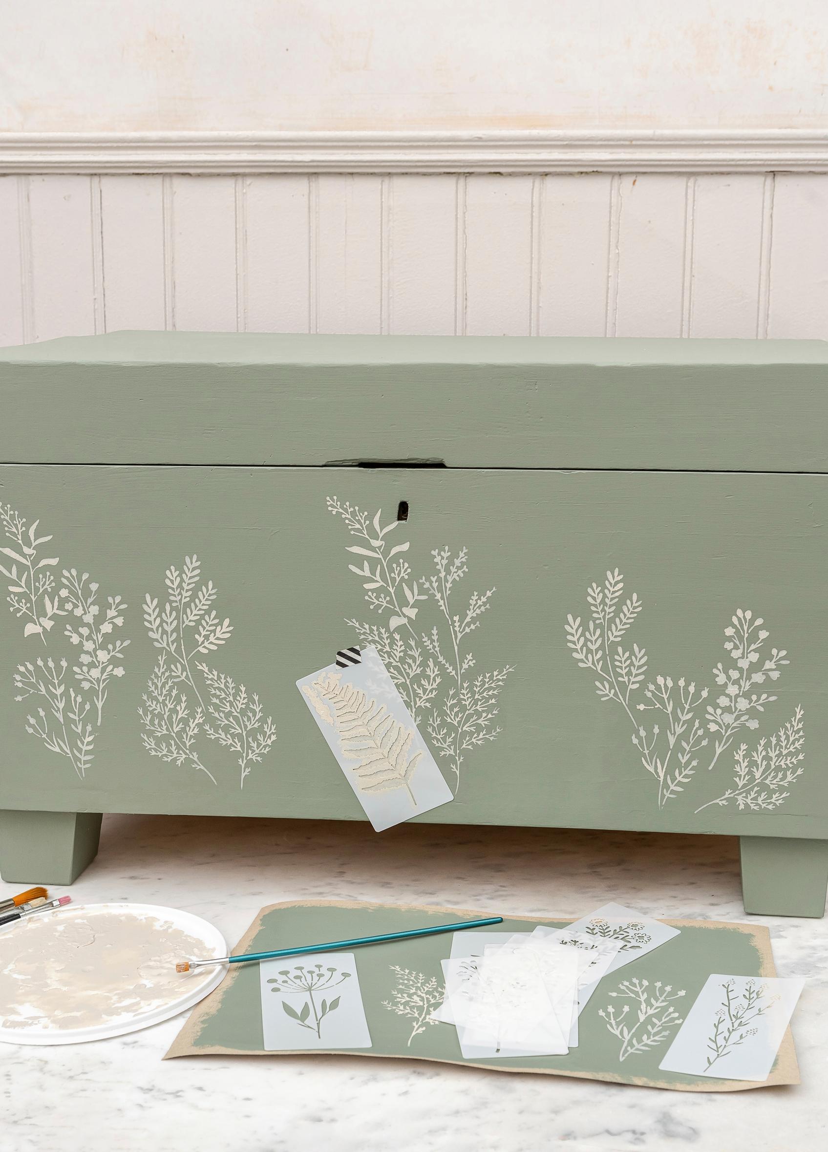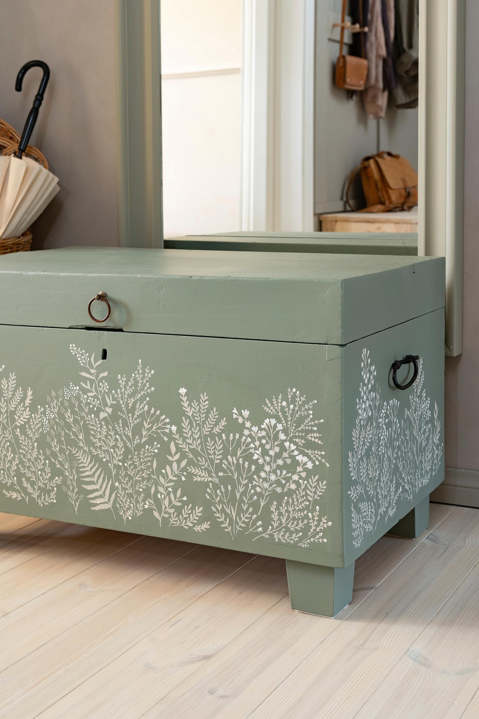Stencils let you create a gorgeous decorative paint job with astonishing ease. This wooden chest now evokes an everlasting summer with plant motifs. Check out instructions from Finnish blogger Katja Rinkinen.
