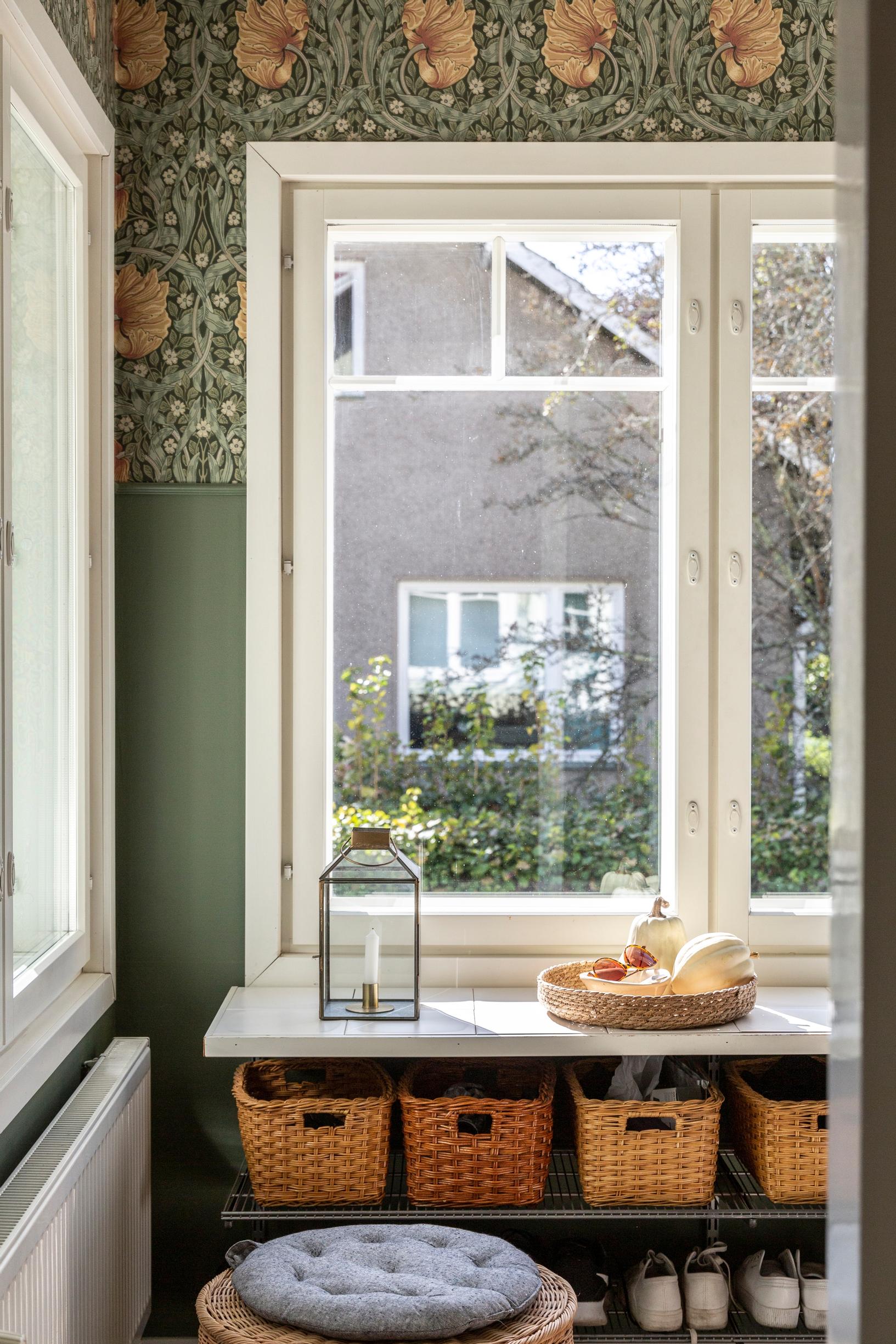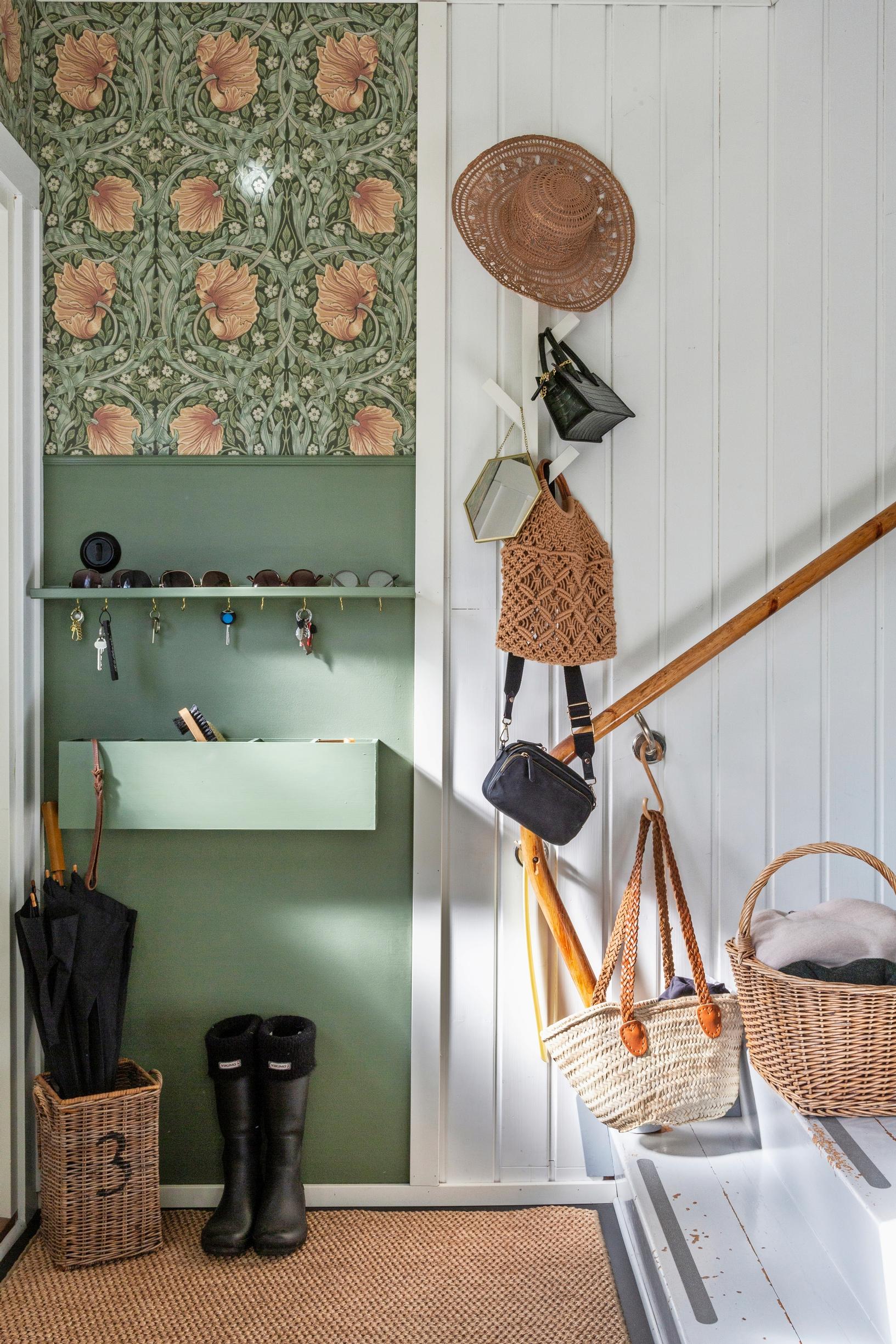 Kati has designated a spot in the entryway for every item. She made the key rack by attaching hooks underneath an IKEA picture ledge and painted the wall in shade S447. For storage, she's bought baskets and S-hooks. The rug is from Veke, and the wallpaper is William Morris’s Pimpernel.