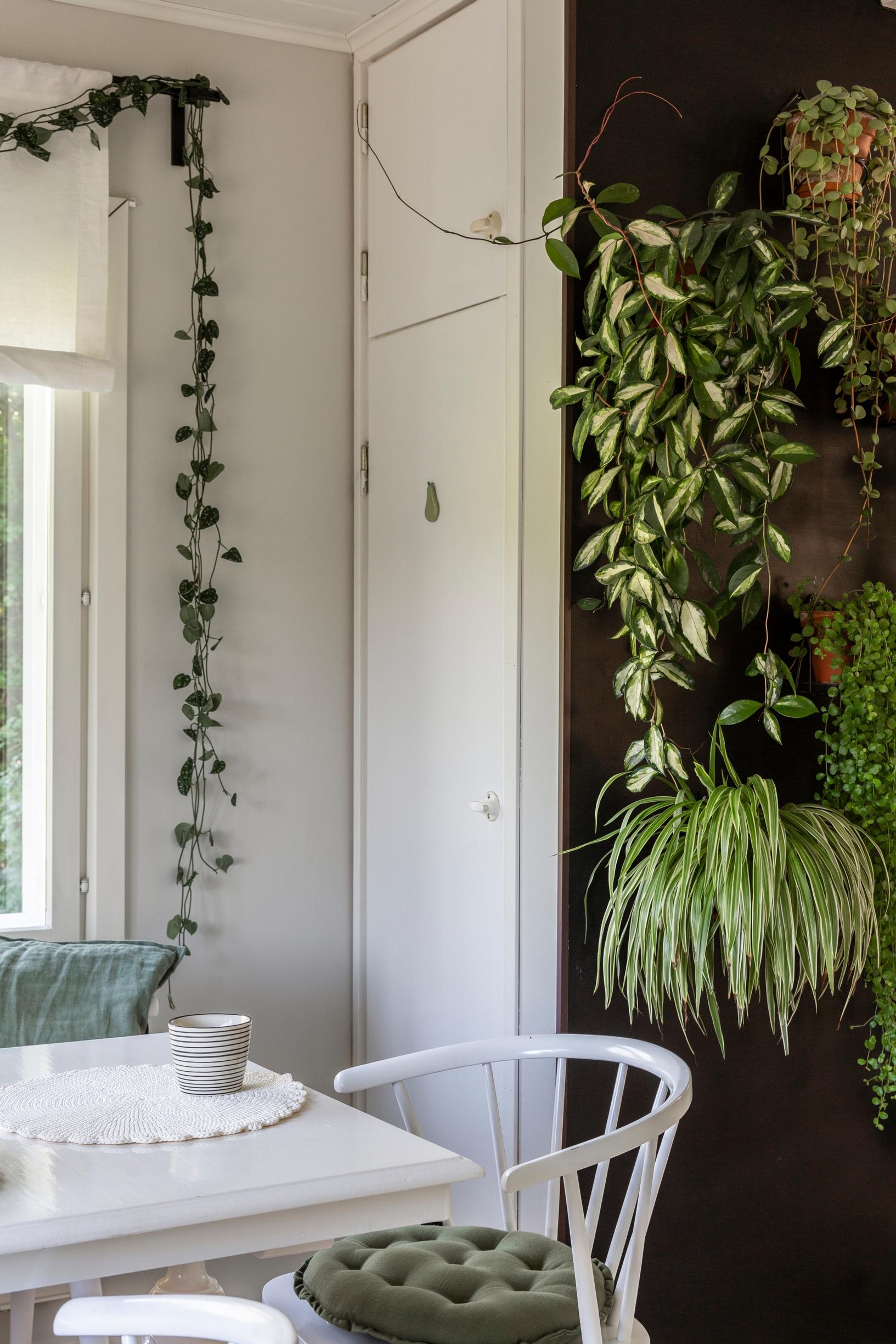 In the breakfast area, Kati created a lush wall of plants. She carefully secured the wall mounts and left space in the soil area to prevent water damage to the floors.