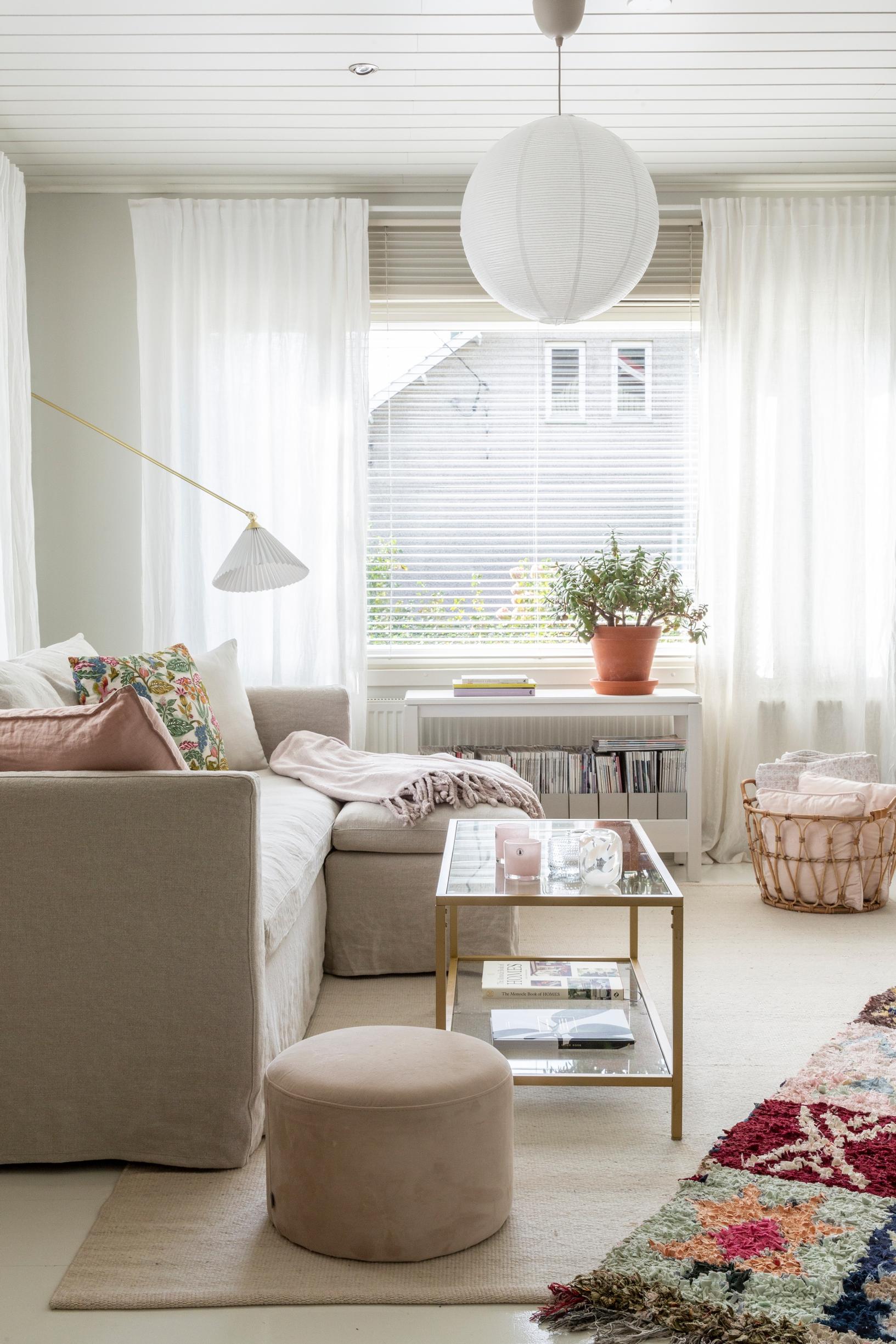 The living room’s linen couch is the Lill from Kruunukaluste. A Boucherouite rug from Trend Carpet adds color. Kati’s daughter Ilta updated the IKEA coffee table with gold spray paint. The plank floors are finished with Betolux Akva, in Tikkurila’s F484 Kalkki shade.
