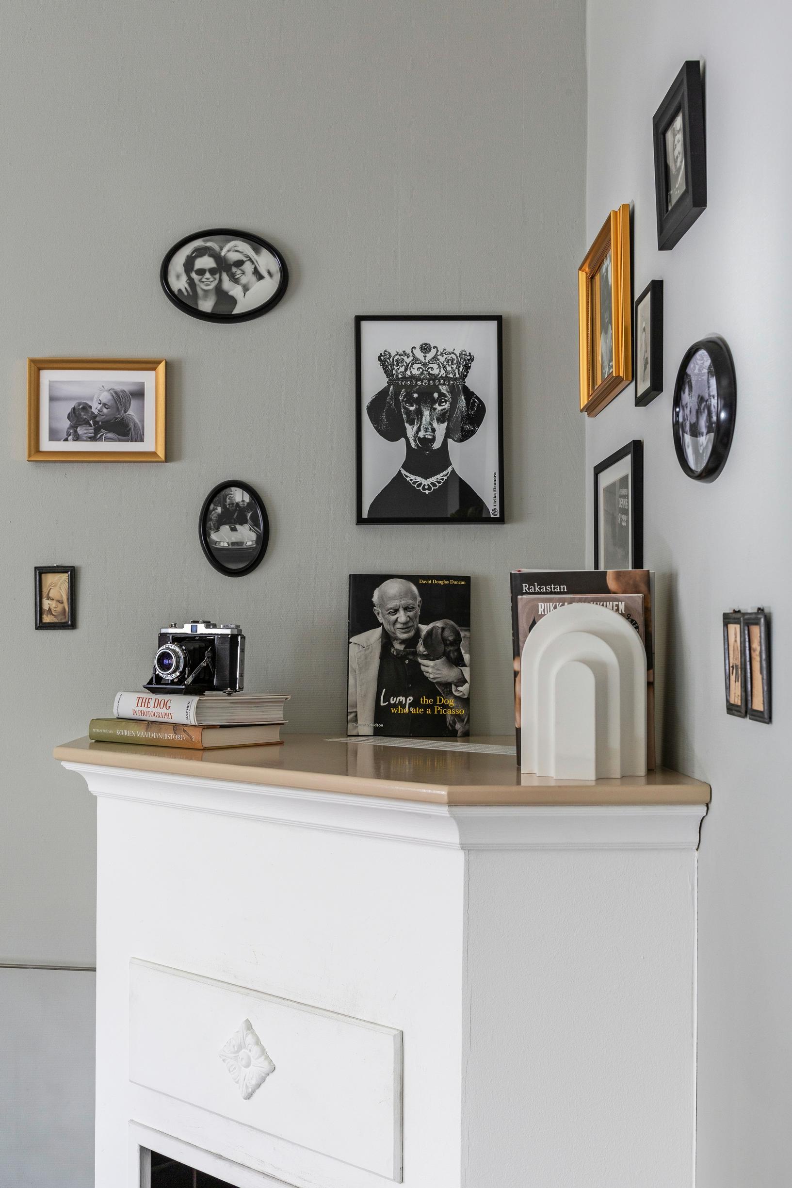 Kati decorated the dining room mantel with family photos. The dachshund print by Lisa Bengtsson pays tribute to the family’s first dachshund.