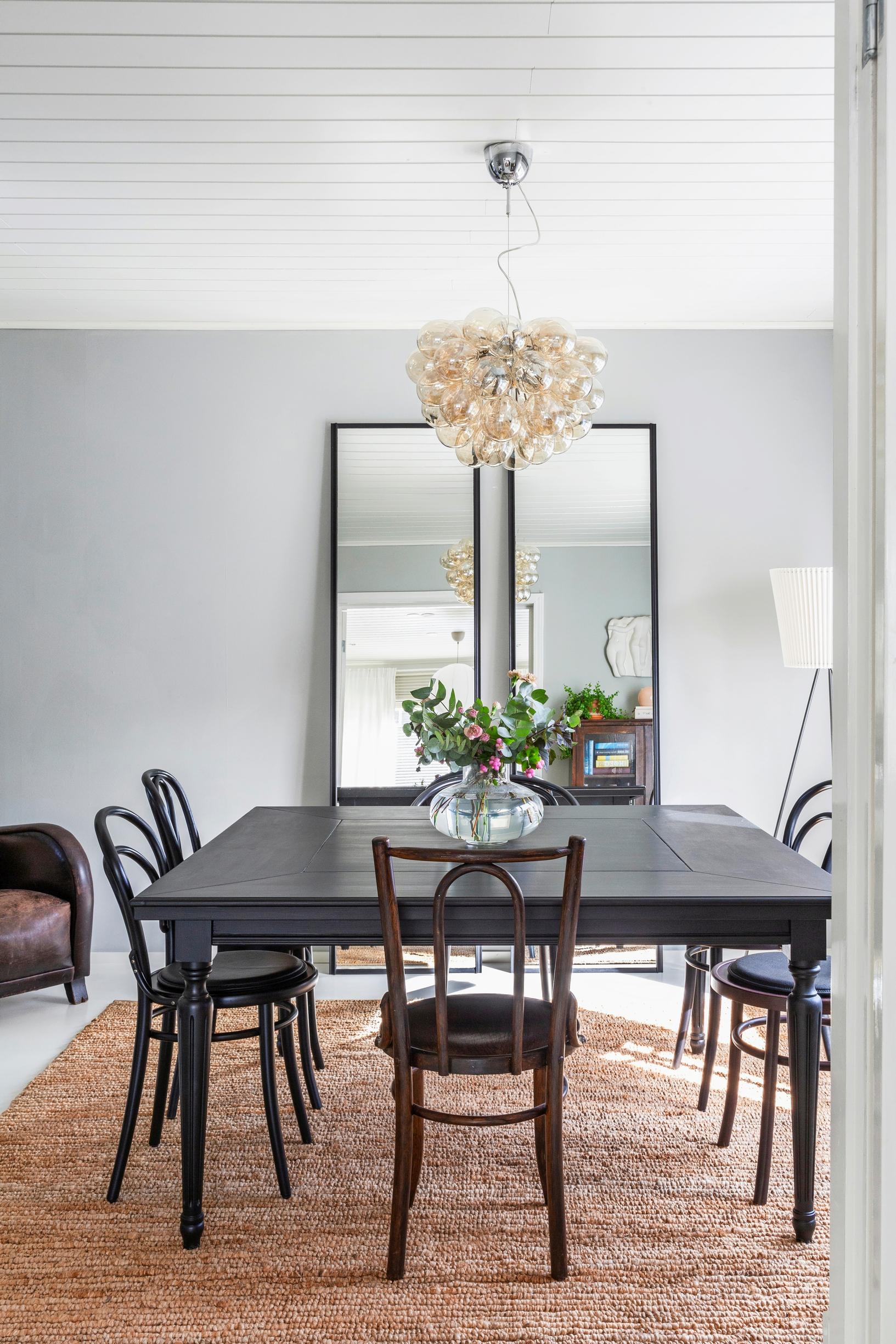 The square dining table, which Osmo made, is Kati’s favorite piece of furniture. The pendant lamp is Gross by By Rydéns. Their daughter Ilta transformed two sliding glass doors into mirrors. The Ton chairs are from Forme, and the rug is from Rugvista.