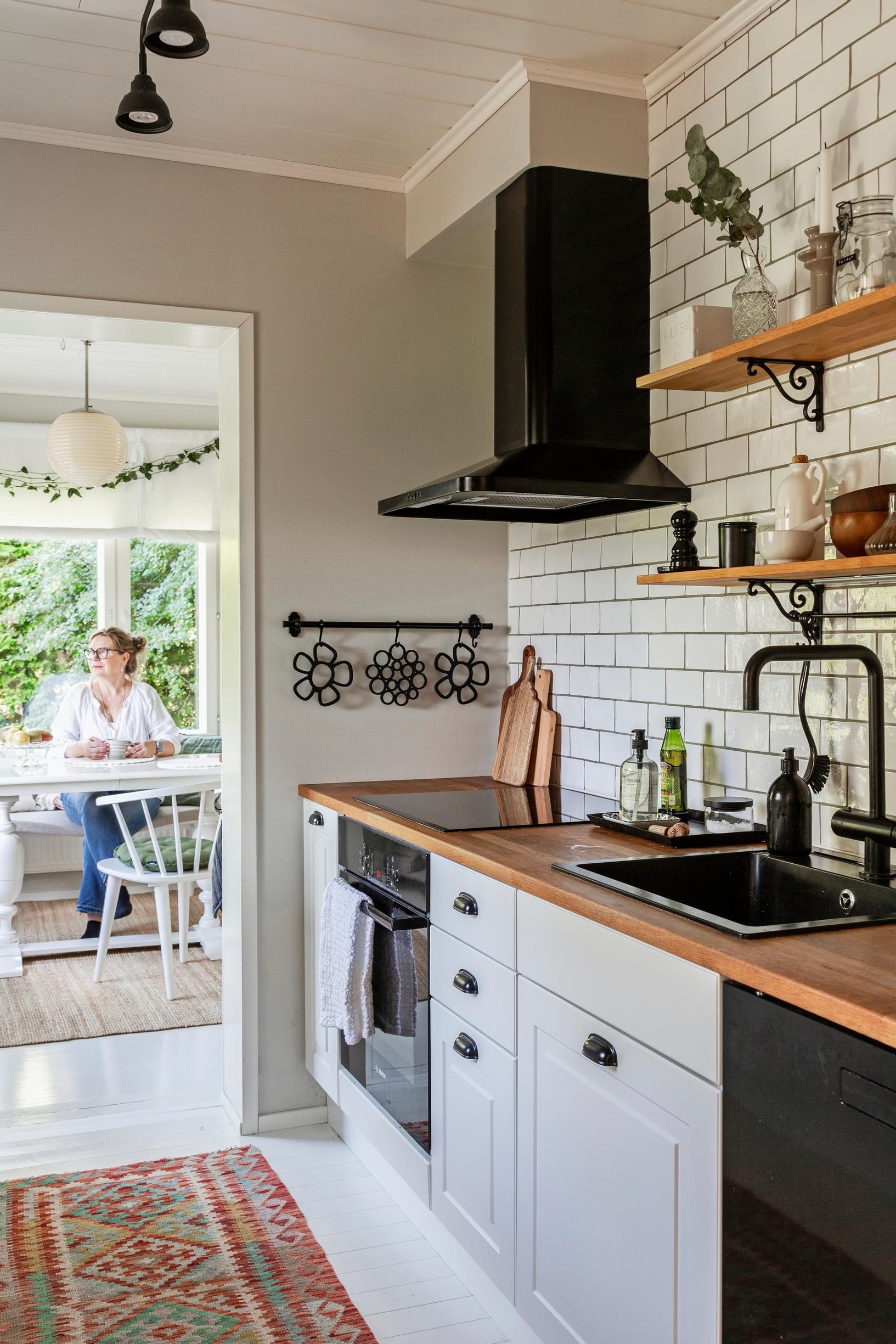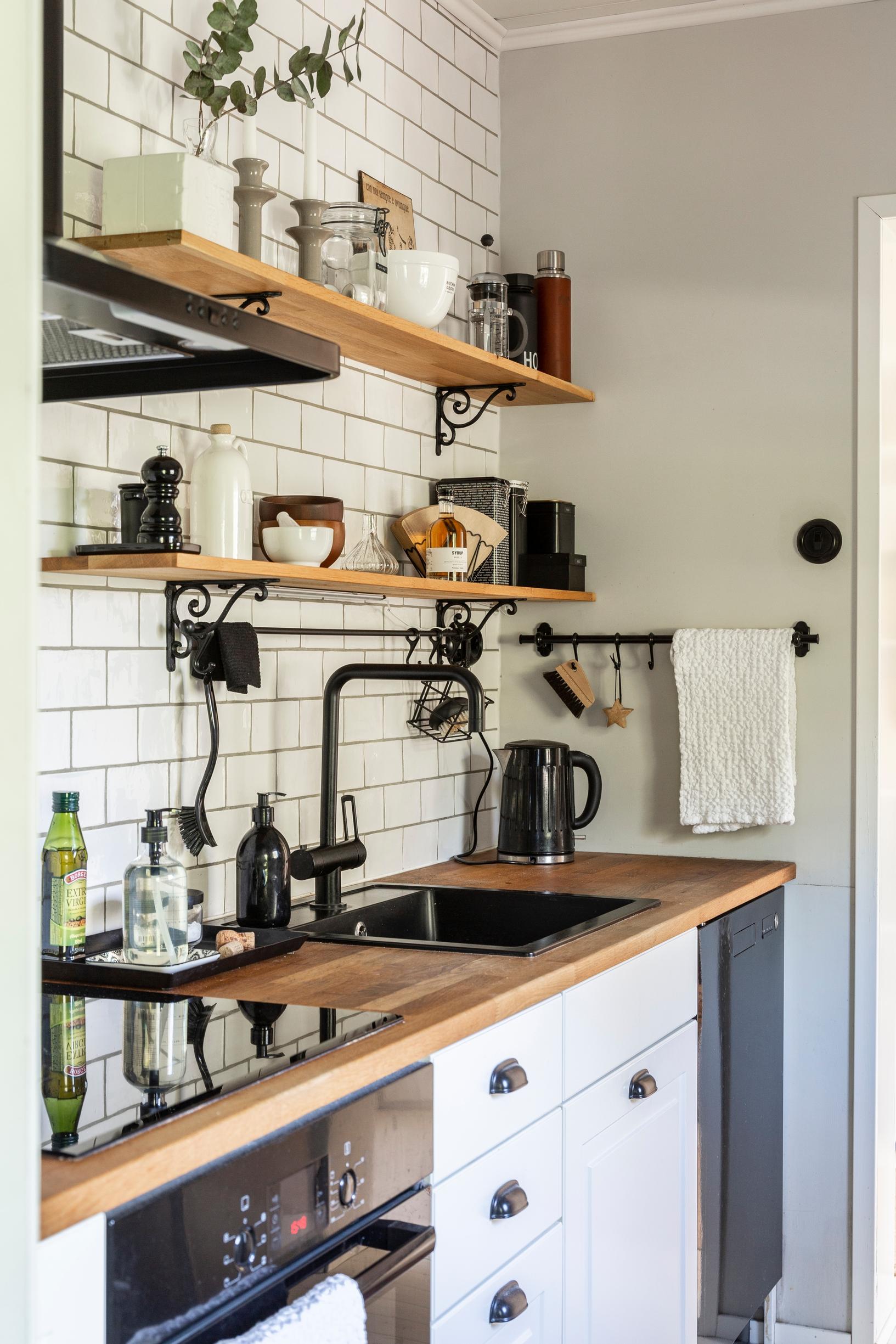 The kitchen layout is functional, with cabinets on opposite walls and a clear walkway. Kati found the shelf brackets at Vanha-Vanno, and the faucet is by Tapwell. She no longer recommends a black flat-bottomed sink or wooden countertops in the kitchen to her clients because they’re difficult to keep clean.
