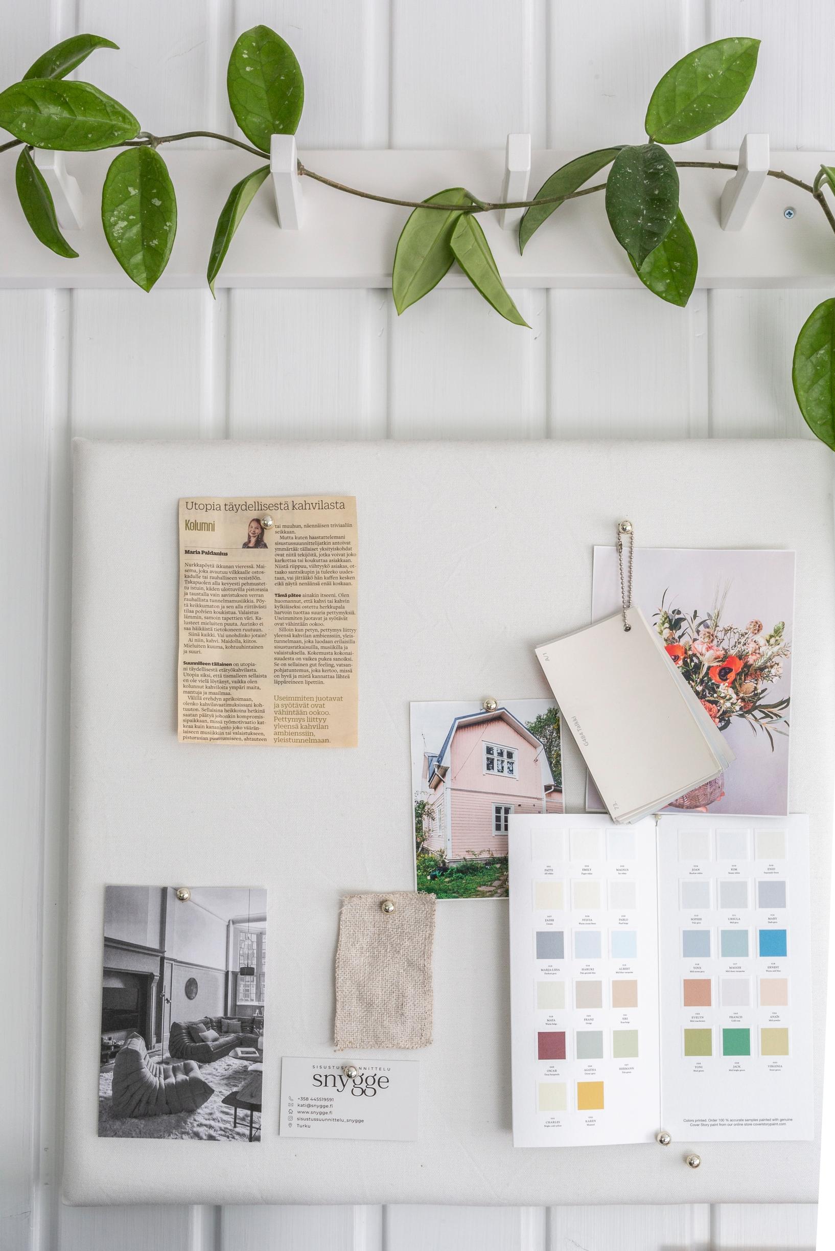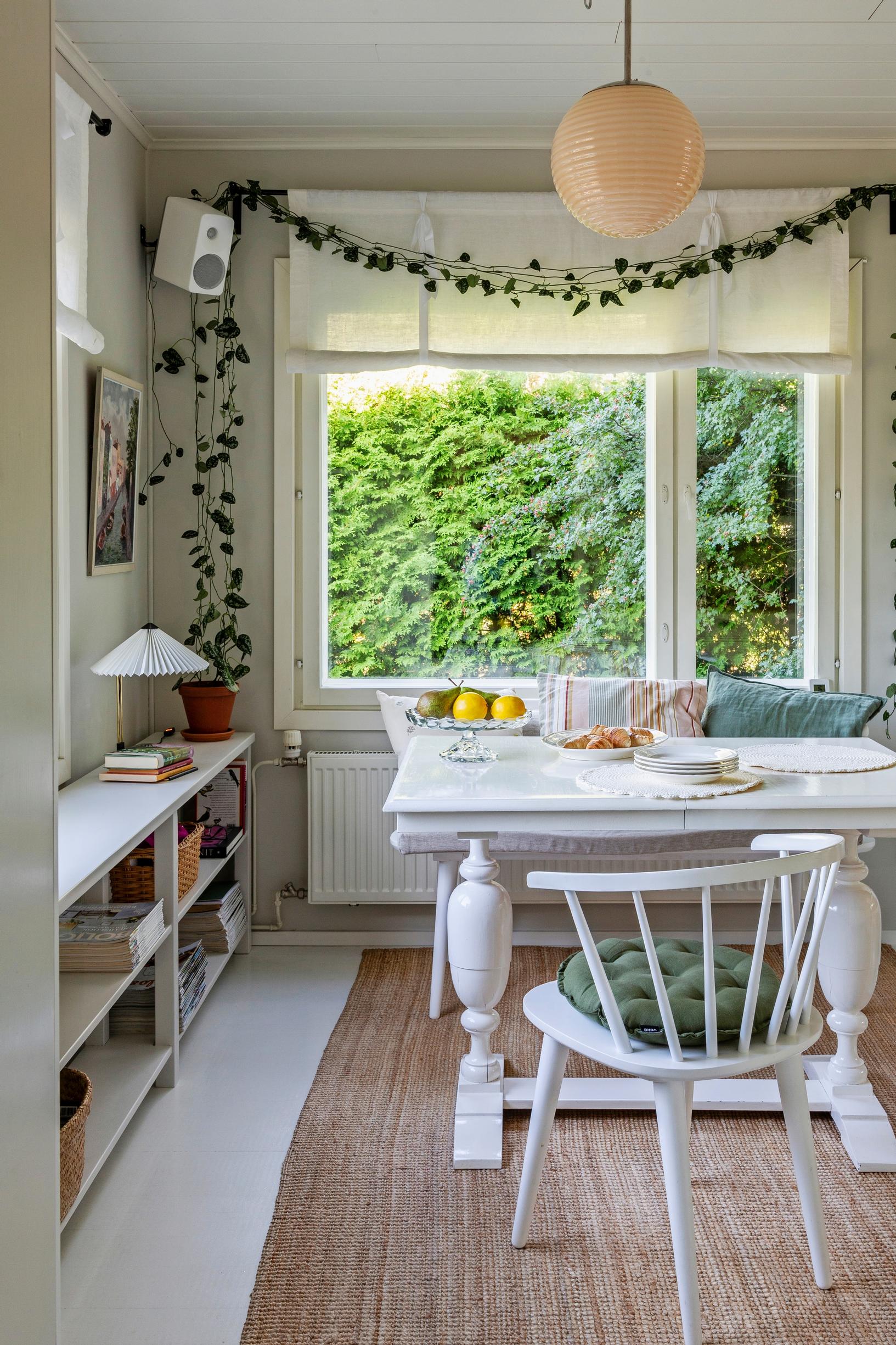 Next to the kitchen is a small nook that’s just right for coffee breaks or a quick lunch. The low shelf made by Osmo offers excellent storage. Kati tucks anything she doesn’t want on display into baskets. The walls and shelf are painted in Tikkurila shade Y487. The table was found on online fleamarket Tori, and the chairs and bench are by Rowico.