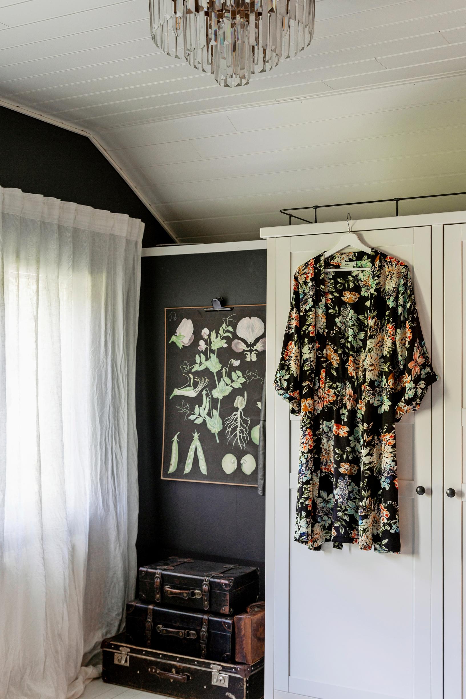 In the bedroom, a black wall feels grounding and calming. The field pea teaching chart is by Ebba Masalin. Some of the suitcases are family heirlooms, and others are flea market finds.