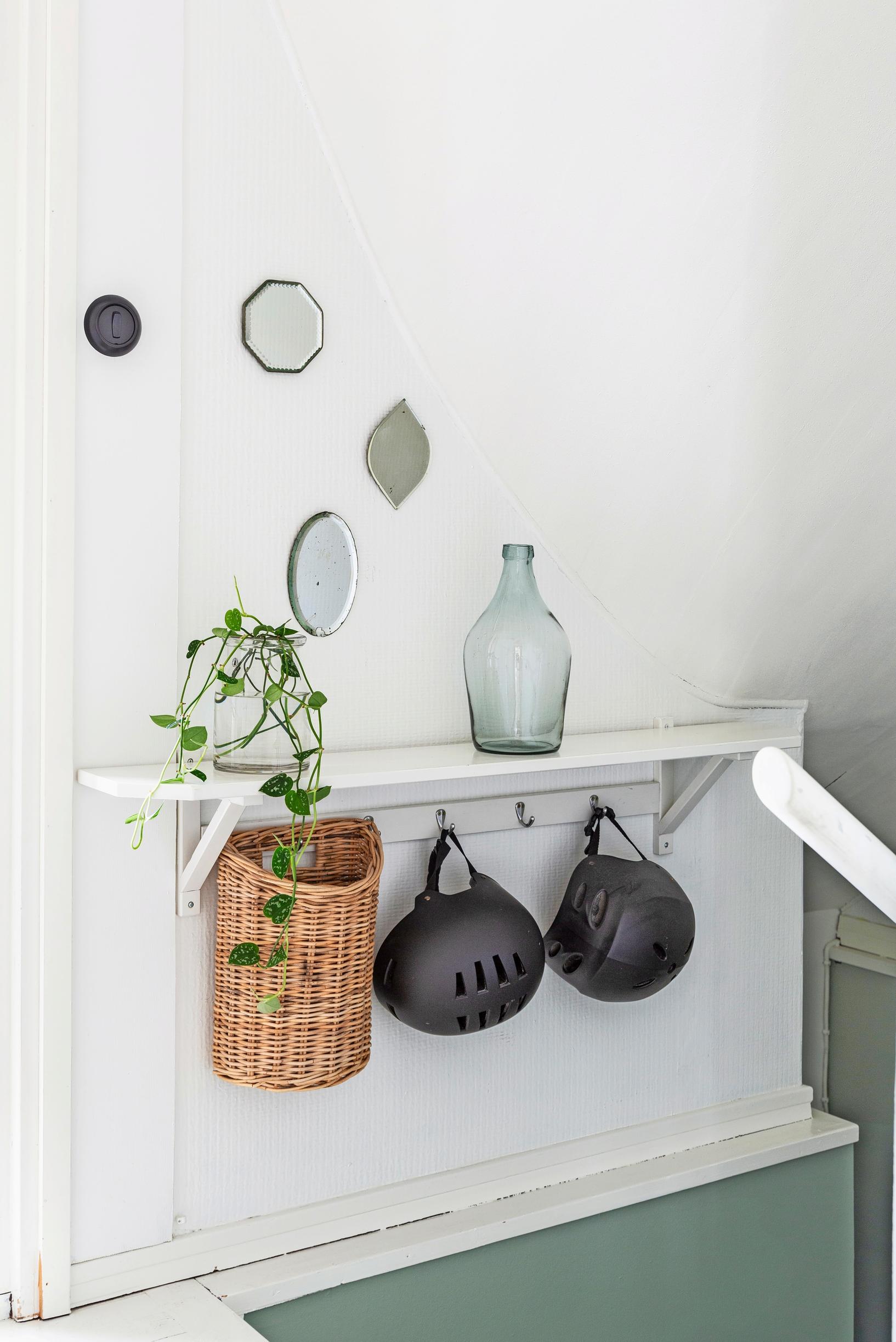 Kati has collected small mirrors on the wall along the stairs to the basement from various flea markets. The shelf is an upcycled IKEA piece. “I buy different baskets wherever I go—there can never be too many,” Kati says with a laugh. The hooks on the shelf also provide a handy place for bicycle helmets.
