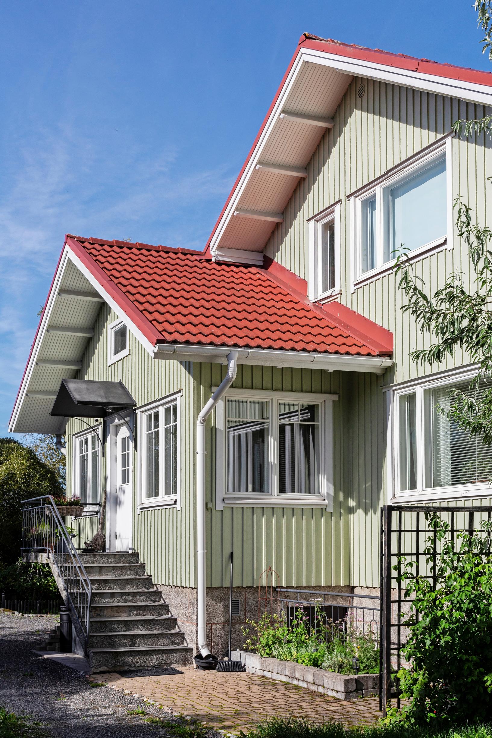 The house was built in the 1950s. The facades were last painted in 2021 with Nordica Eko shade 592X. The doorway awning was a custom design.