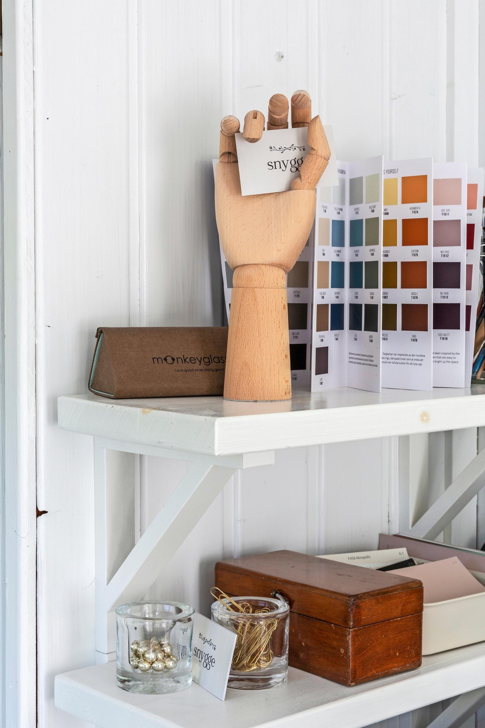 On the shelf in her office, Kati has gathered items that are both necessary and beautiful. She likes having things in order, even if they’re on display. The wooden hand holding her business card is from IKEA.