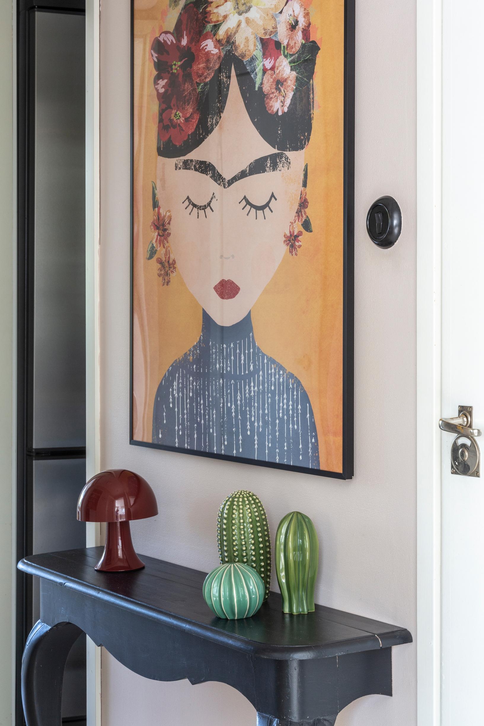 A Frida poster from Poster Store adds vibrancy to the hallway behind the kitchen. The ceramic cacti are from IKEA. Kati halved an old table to make a side table and painted it black with chalk paint.