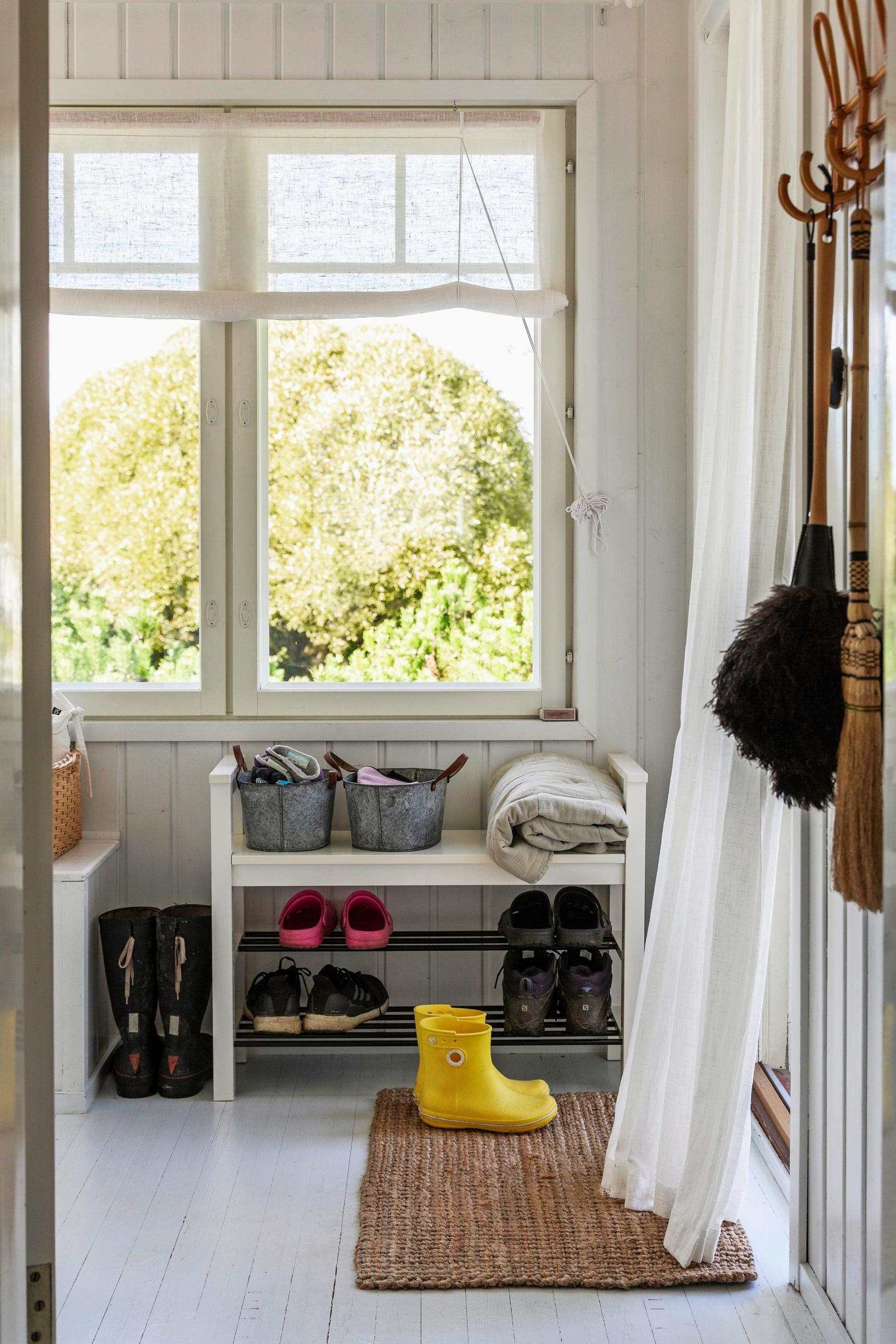Her office opens directly onto the backyard garden and pergola, where she can work on warmer days. The shoe rack is from IKEA, and the stylish cleaning tools are from Andree Jardin and Torkel Design.