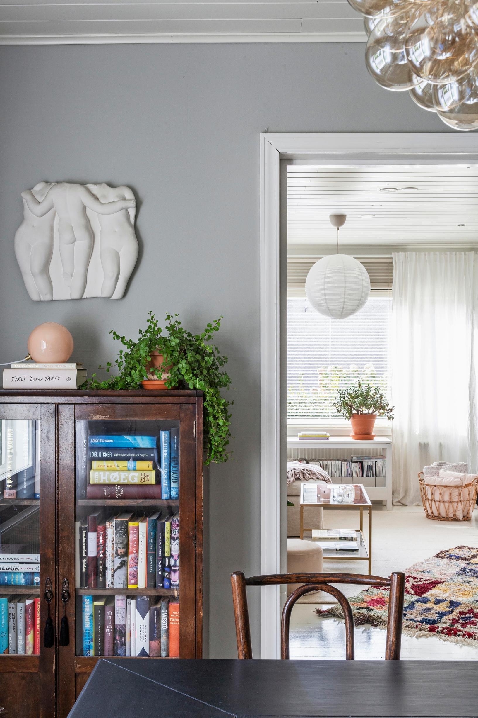 A plaster figure on the dining room wall was a gift from Osmo’s parents, and it’s one of Kati’s favorite objects. The glass cabinet is a vintage store find. The wall color was selected from Tikkurila’s Pro Grey chart.