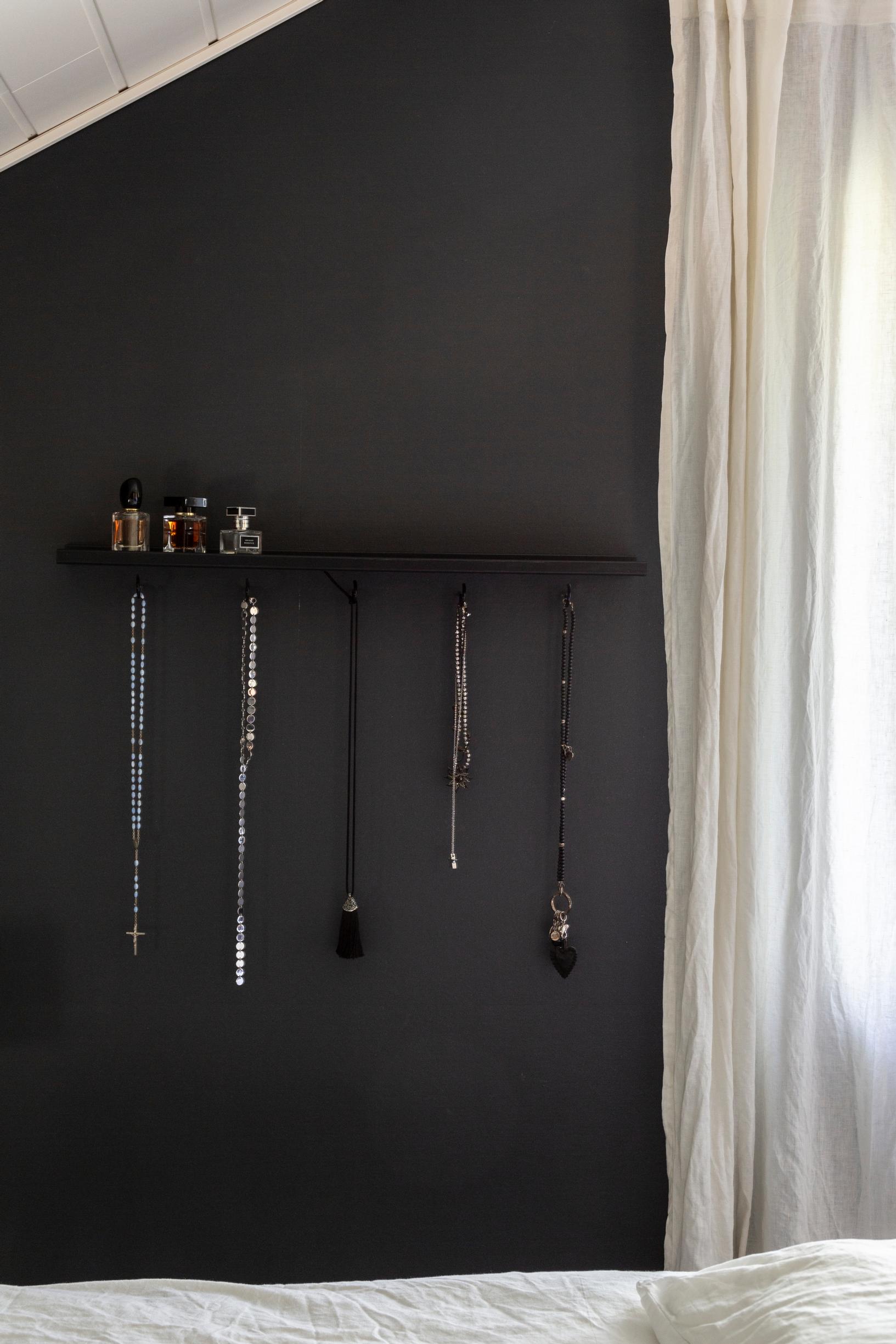 Kati converted an IKEA picture ledge into a jewelry rack by painting it black and adding screw hooks underneath.