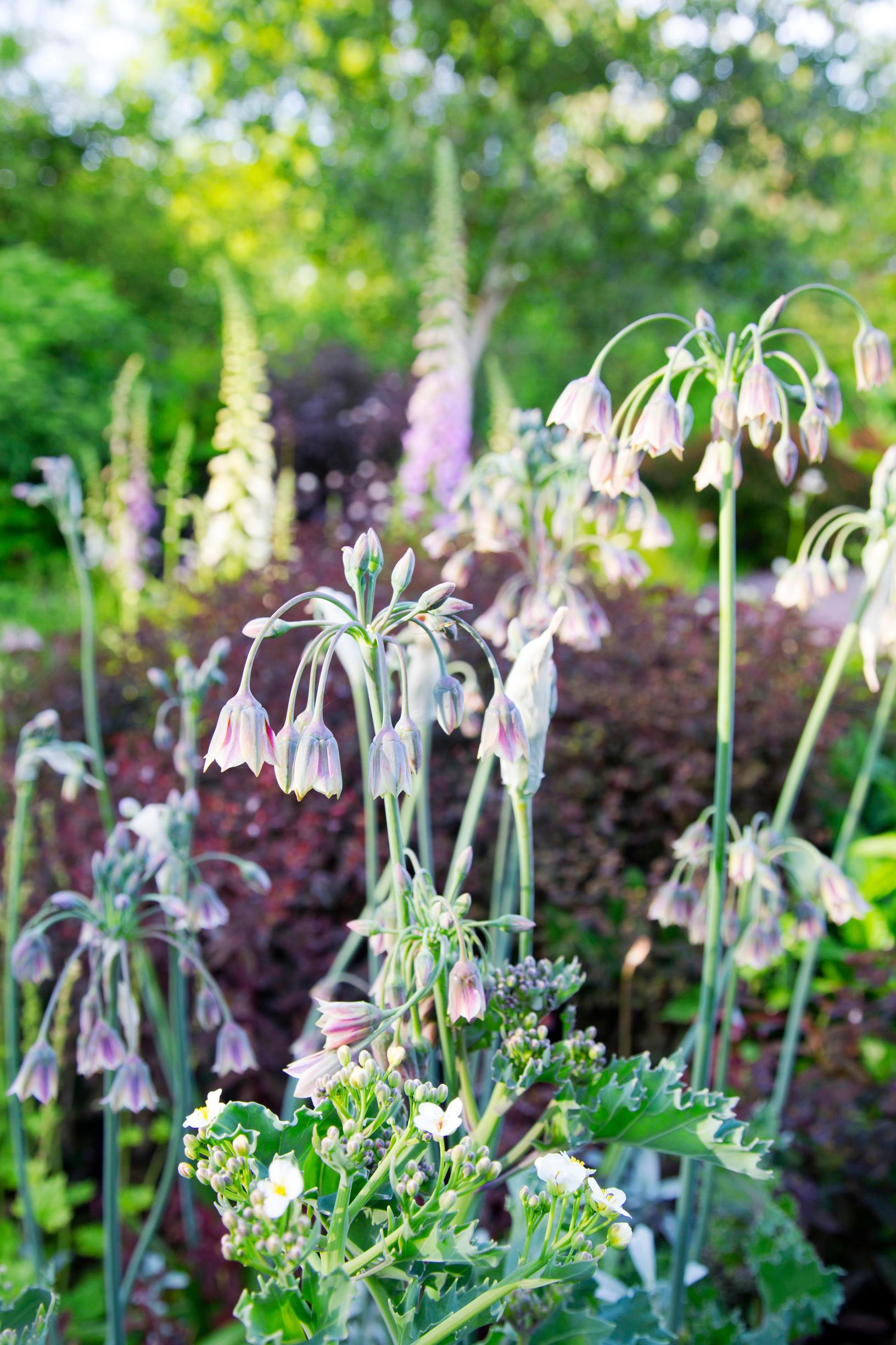 The inflorescence of Sicilian honey garlic doesn’t form a tight sphere. Instead, individual flowers droop from the top of the stem like a loosely spaced umbrella. Its petals, with yellow-green and reddish hues, bring lively contrast among solid-colored varieties. At about 20 cm (8 in.) tall, the bell-shaped blooms of Lombardy garlic offers a different look, while the flower head of pisarapunalaukka resembles a splashing burst of water. Along with varied flower shapes and colors, picking alliums of different heights can add even more interest.