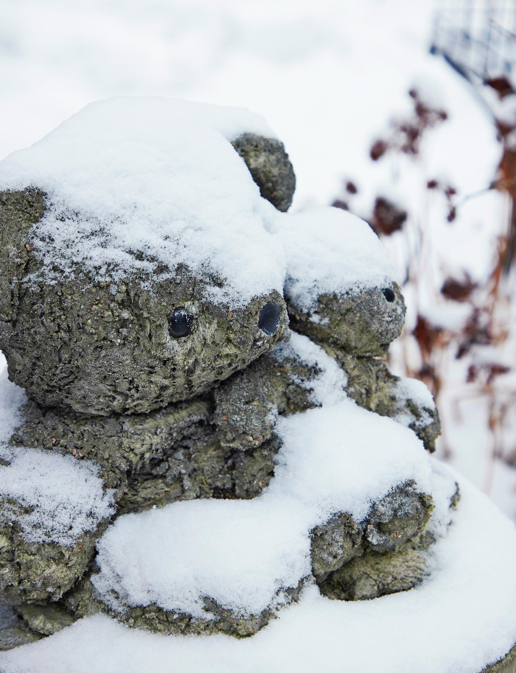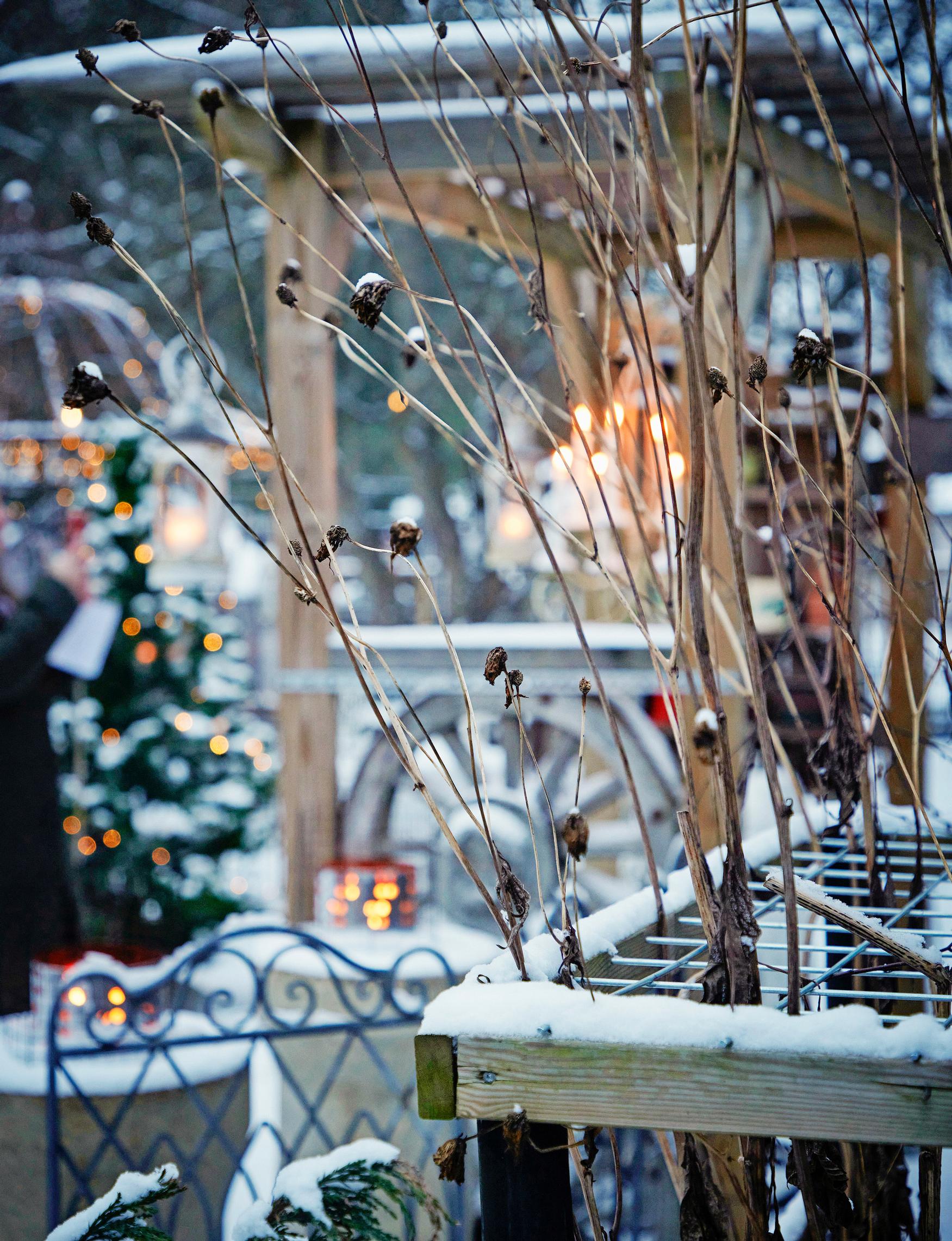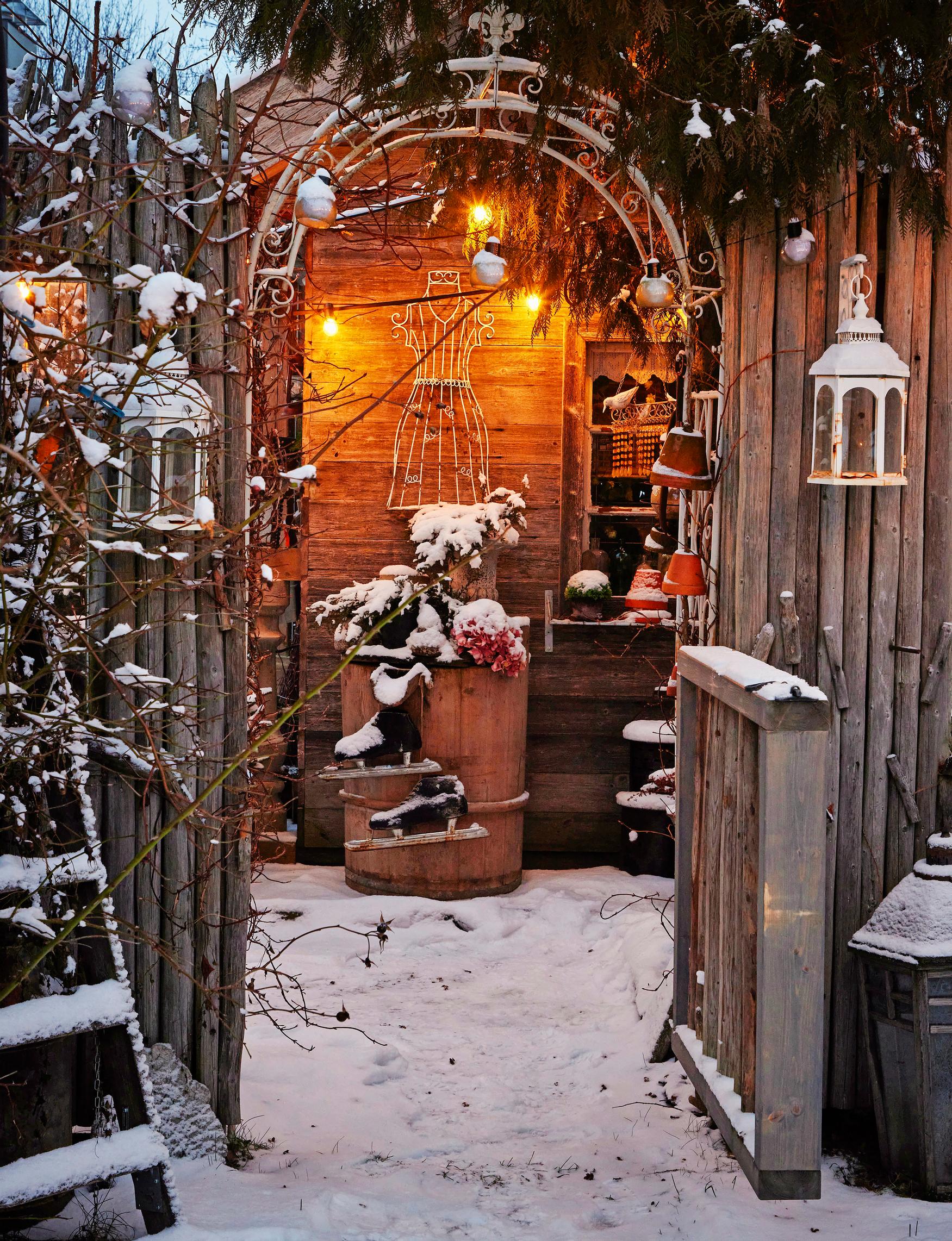 Even though there’s a Santa sitting on a swing hung from a branch of the old spruce, another climbing a rope ladder up the house wall, and lanterns numbering in the dozens, most of the garden’s decorations stay in place year-round. This garden is all about abundant detail—poetic rusticity with a playful flourish.