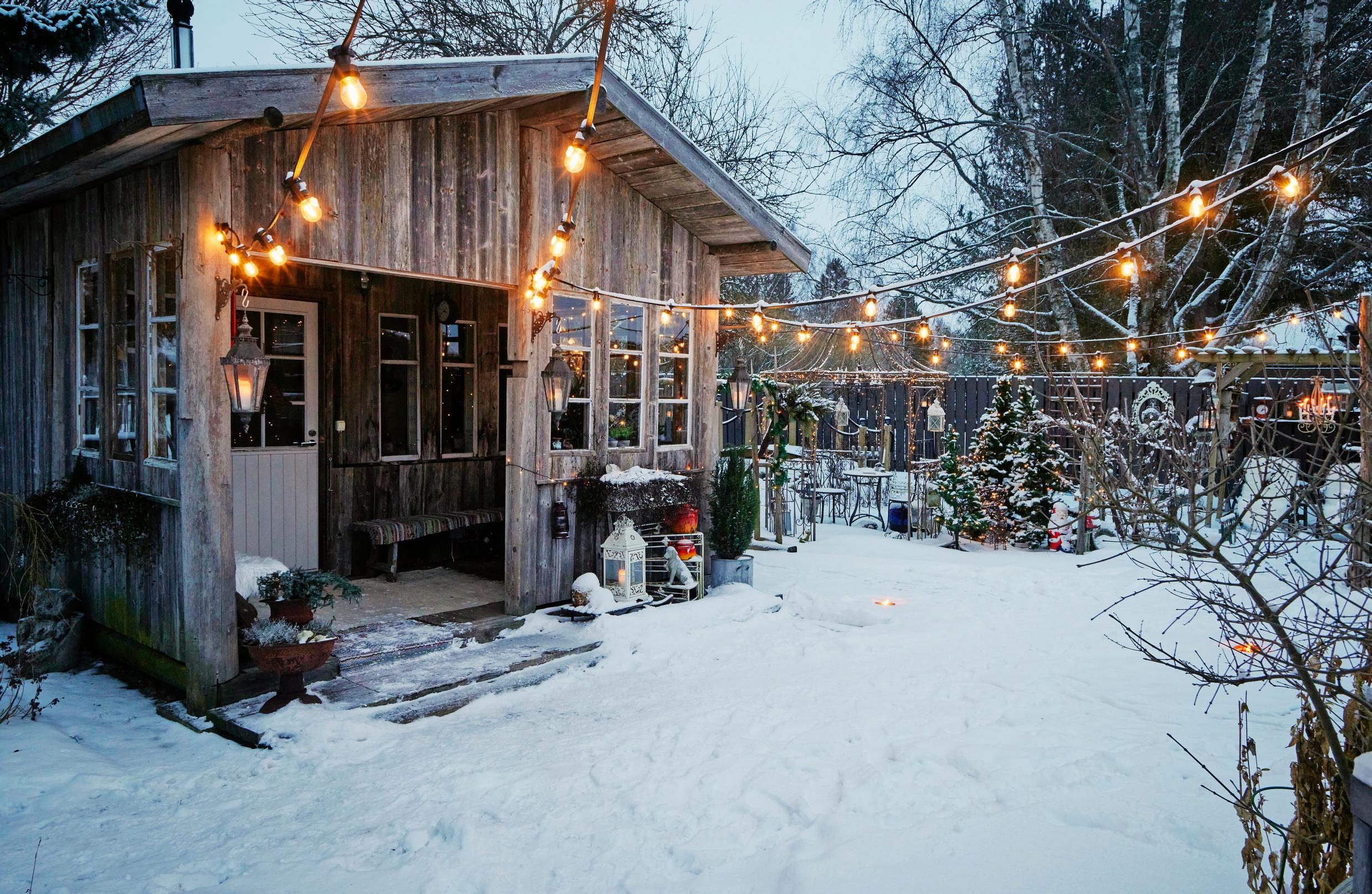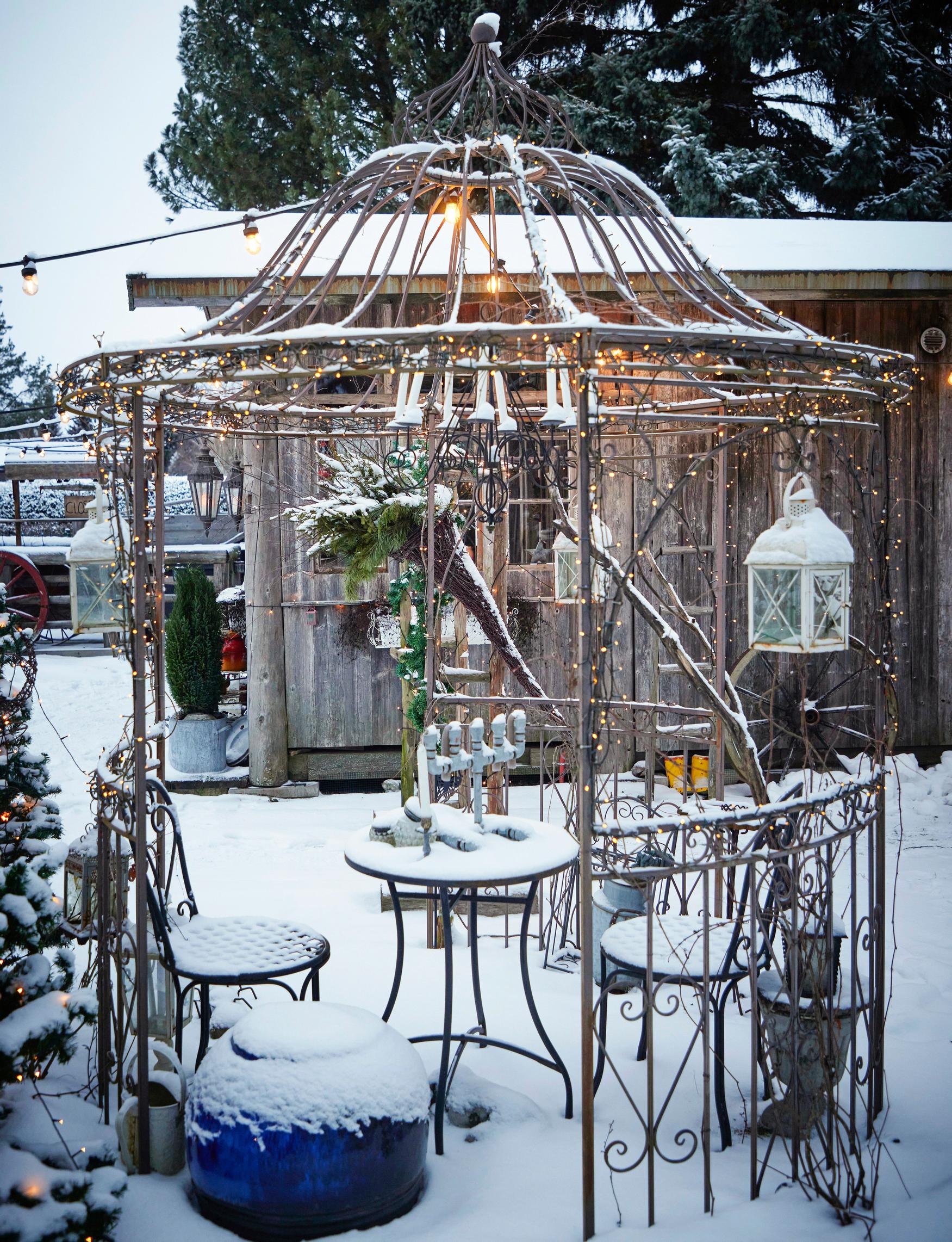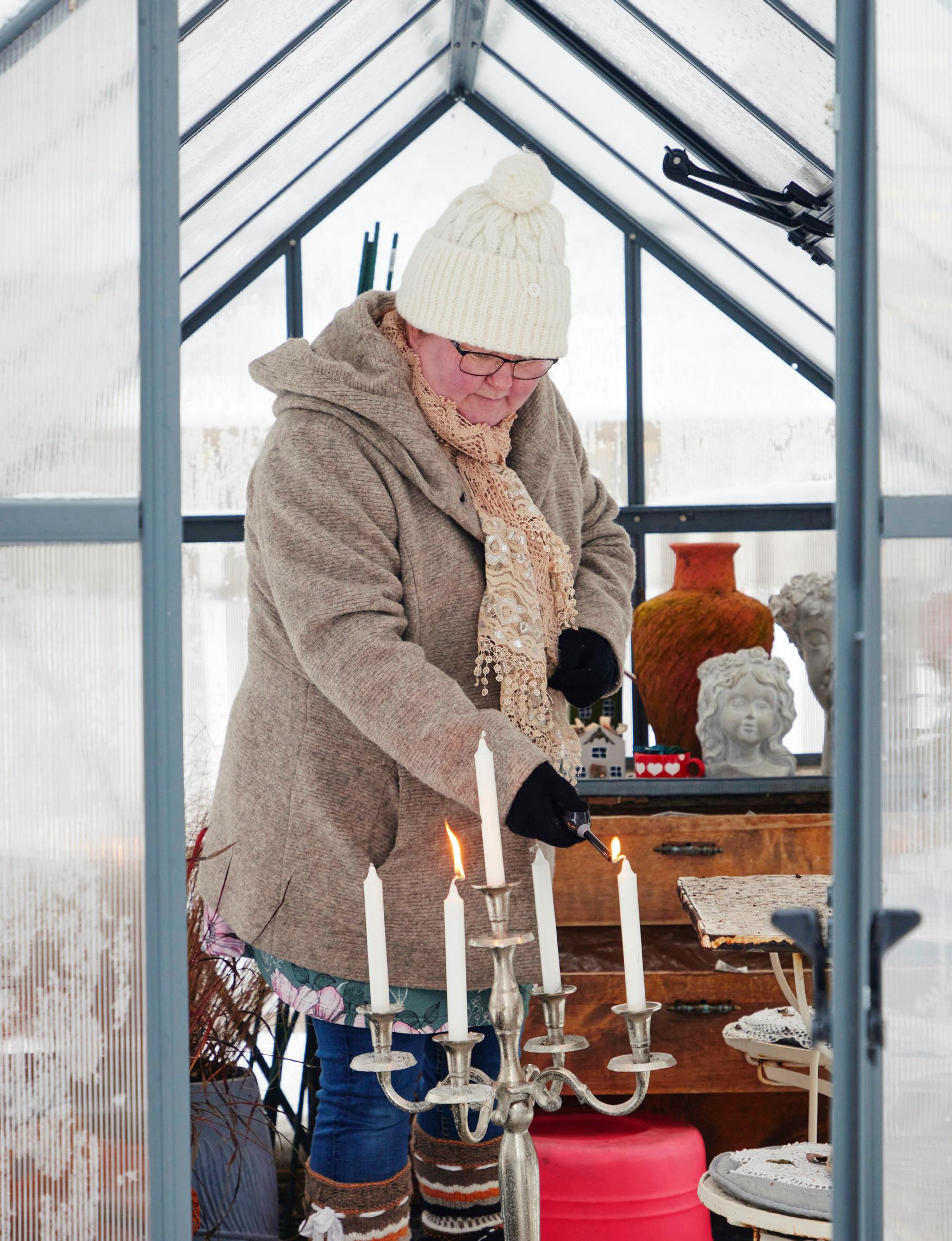 until the end of November, Tarja holds herself back. Then she starts building Christmas mood with lights and lanterns. By Independence Day, she has dressed the garden for Christmas. For passersby, Tarja creates a Christmas window—or really, an entire cottage.