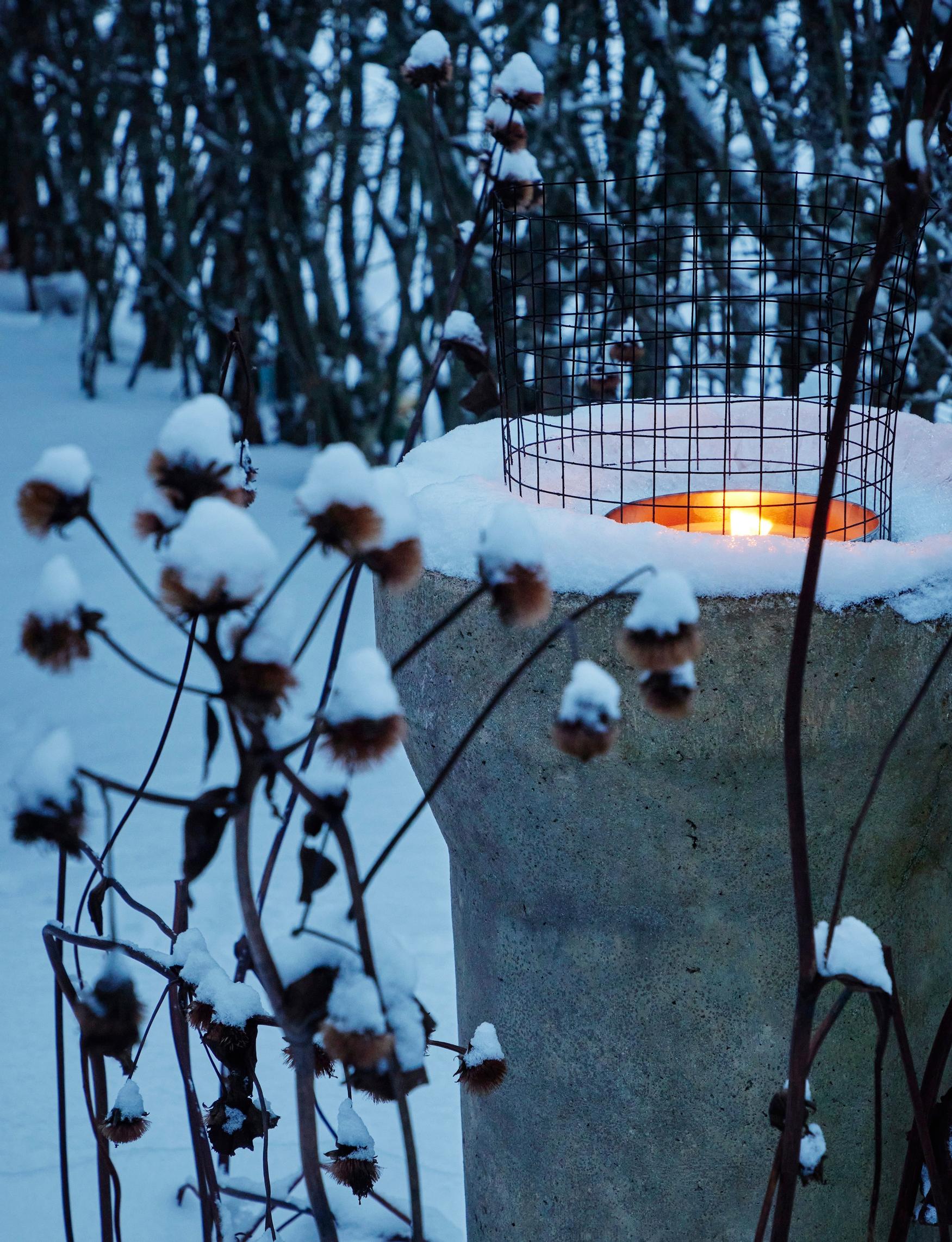 All the structures are decorated imaginatively—but affordably. Tarja has made the most of flea-market finds: metal trays, old baking tins, lace curtains, chandeliers, and old tools. She also finds beauty in everyday objects like cast-iron skillets. One example of her ingenuity is the hefty concrete pillars under the outdoor fires: they’re old sewer pipes Tarja asked to salvage from a street renovation. They pair perfectly with the concrete ornaments in her arrangements, many of which she has made herself.