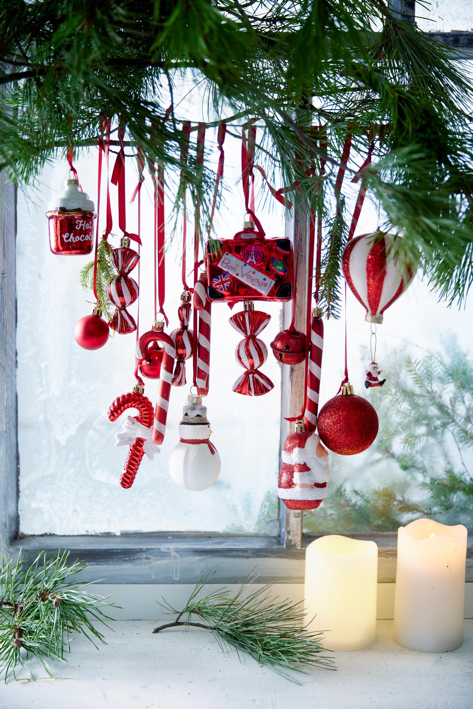 Hang a playful ornament calendar in the window. Each day, attach one ornament to a ribbon. Tie each one to ribbons of different lengths to give the display a nice rhythm.